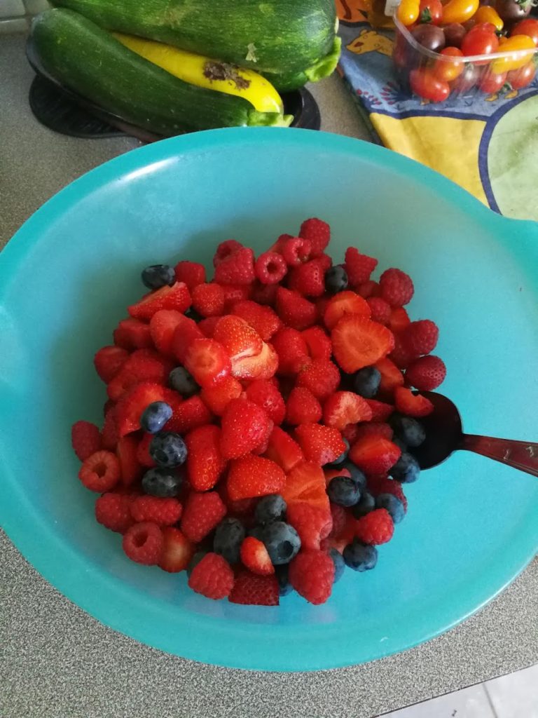 I nostri amici Caro e Mathieu vengono a pranzo con noi in giardino, e ci preparano una deliziosa macedonia di frutta con panna montata fatta in casa (miaaamm – ho dimenticato di fare una foto del dessert, perché ho mangiato troppo in fretta)