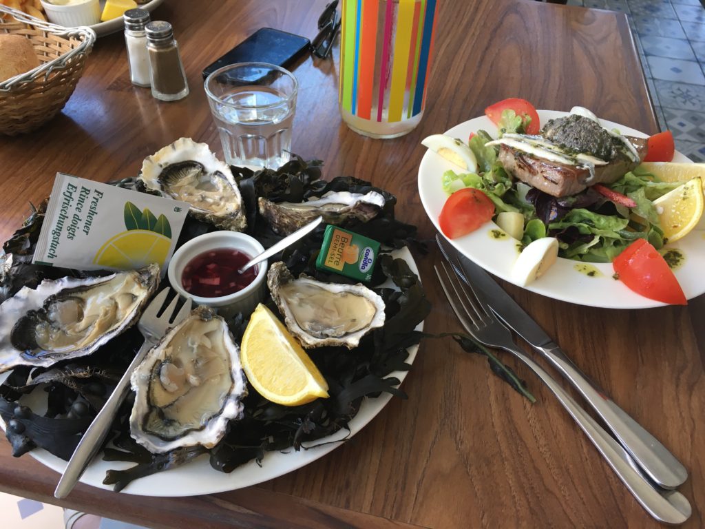 Oggi, Caro e Mathieu (che vivono a Nantes) mi vengono a prendere a casa e mi portano a Batz sur Mer, per un delizioso pranzo a base di pesce a L’aporrhais. Avevo dimenticato quanto potessero essere buone le ostriche, quanto mi piacesse mangiarle. Se andate allo stesso ristorante, ricordatevi di prenotare sulla terrazza, è all’ombra e ci sarà meno rumore