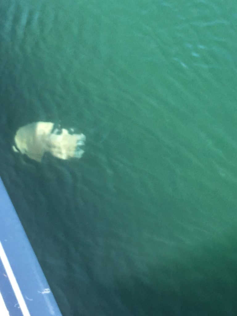 Vediamo due meduse enormi che devono avere almeno 40 cm di diametro. Penso che se li avessi visti nuotare mi sarebbe venuto un infarto