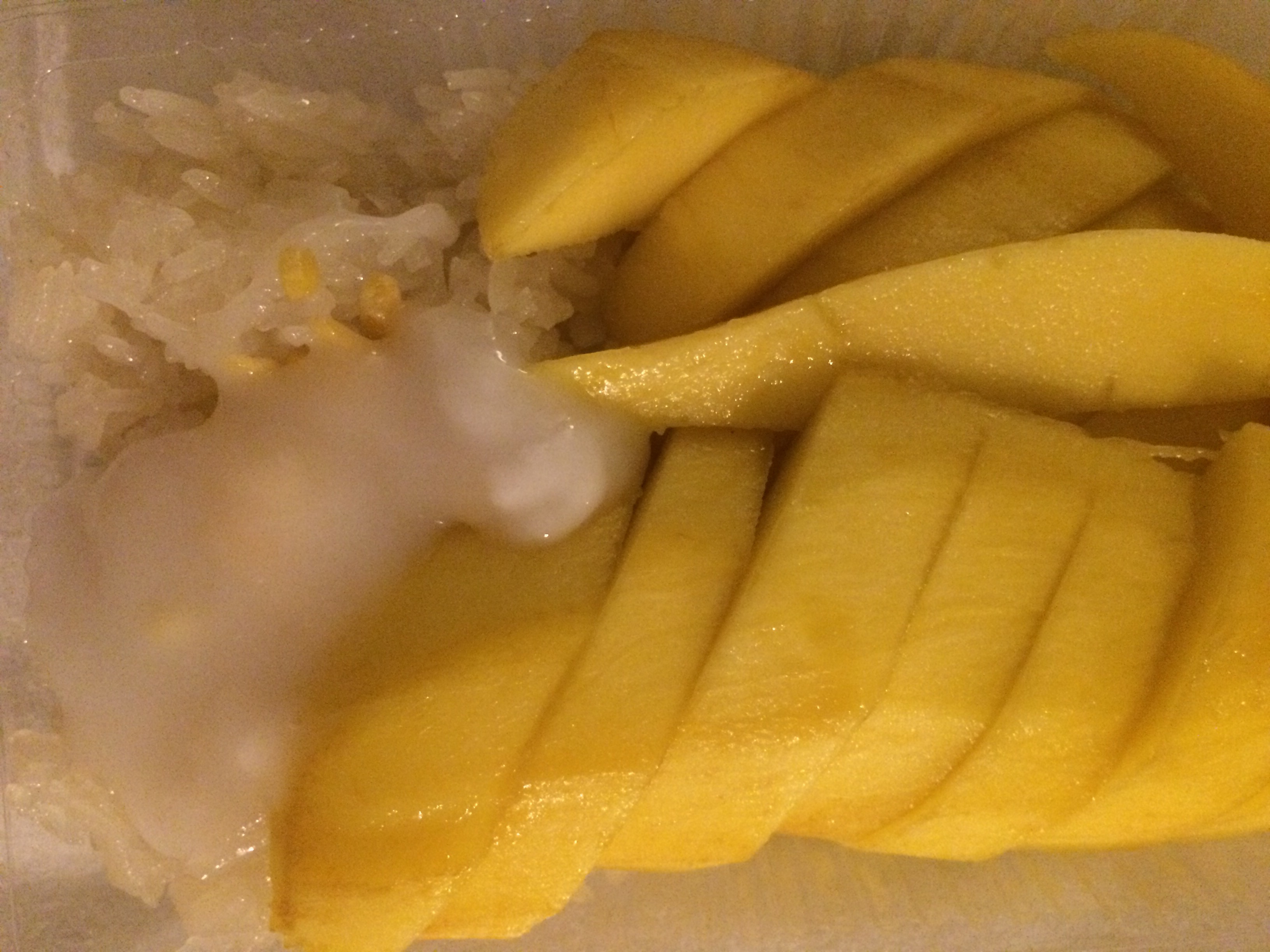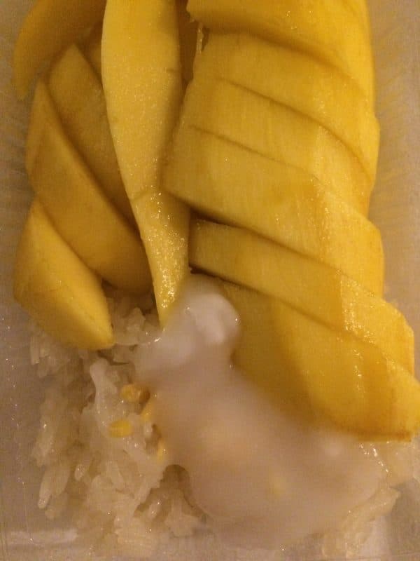 Mi fermo a comprare un set di “sticky rice with mango” (da provare secondo il backpacker). Anche se sono abituato al mix dolce e salato vietnamita, questo piatto è davvero terribile.