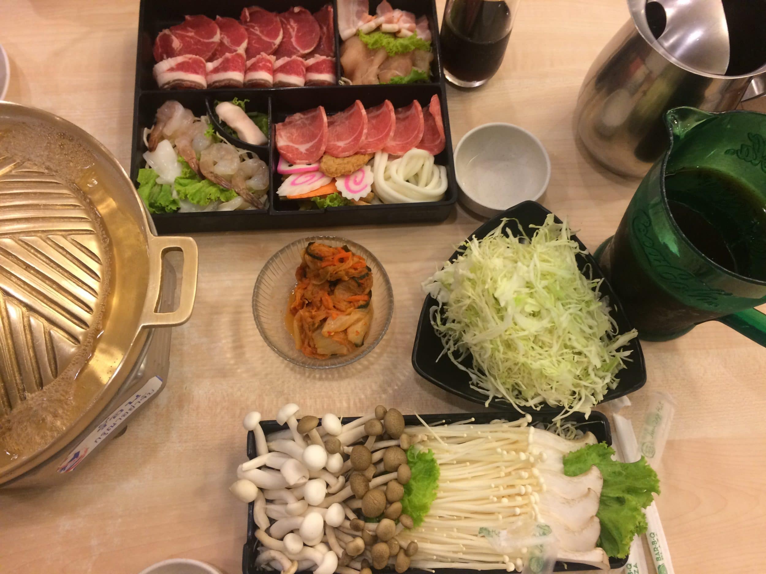 Il Thai BBQ è un misto tra il BBQ e la fonduta: bisogna oliare il vassoio con un pezzo di grasso e poi grigliare la carne. Il succo della carne darà il sapore al brodo. Il cavolo dato generosamente darà anche sapore. Puoi aggiungere acqua regolarmente (c’è una brocca, all’inizio pensavo fosse acqua lol). La brocca di Coca Cola è enorme (1 litro almeno). Puoi scegliere set (con un mix di carne, verdure) o piccole proporzioni separatamente. Per 1200 baht, ci siamo davvero divertiti.