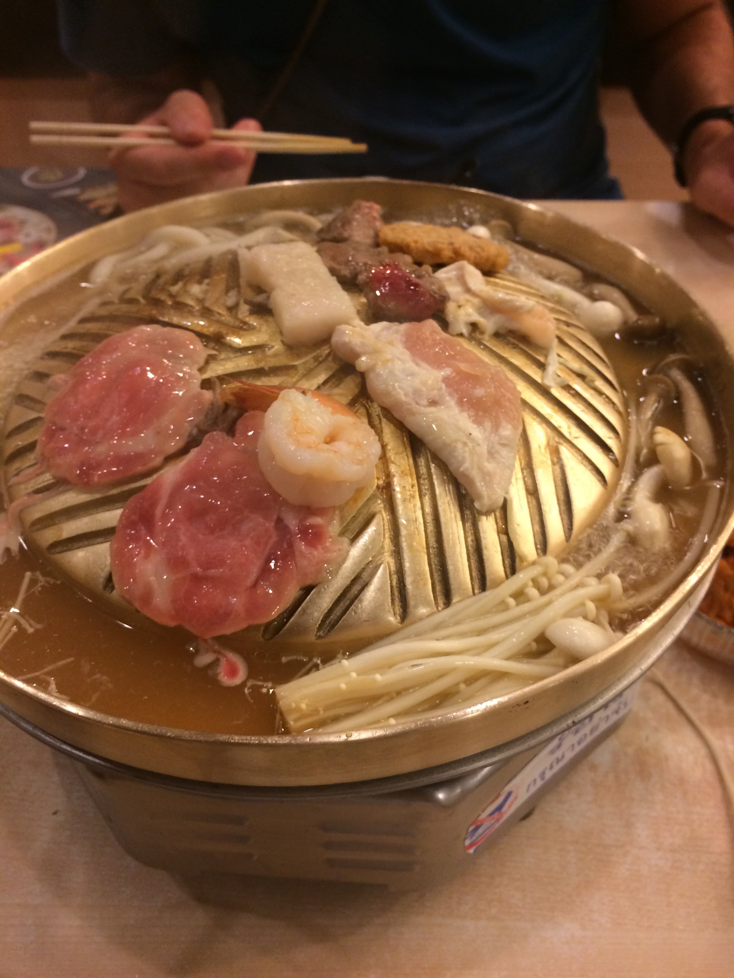 Se ti fa venire voglia di provare anche tu, ti avverto: la carne che ci danno è semi-congelata. Non è marinato. Tuttavia, la salsa fornita è superba e fa dimenticare totalmente questo inconveniente. Il brodo manca un po’ di sapore, ma questo è sempre il caso di tutte le fondute asiatiche.