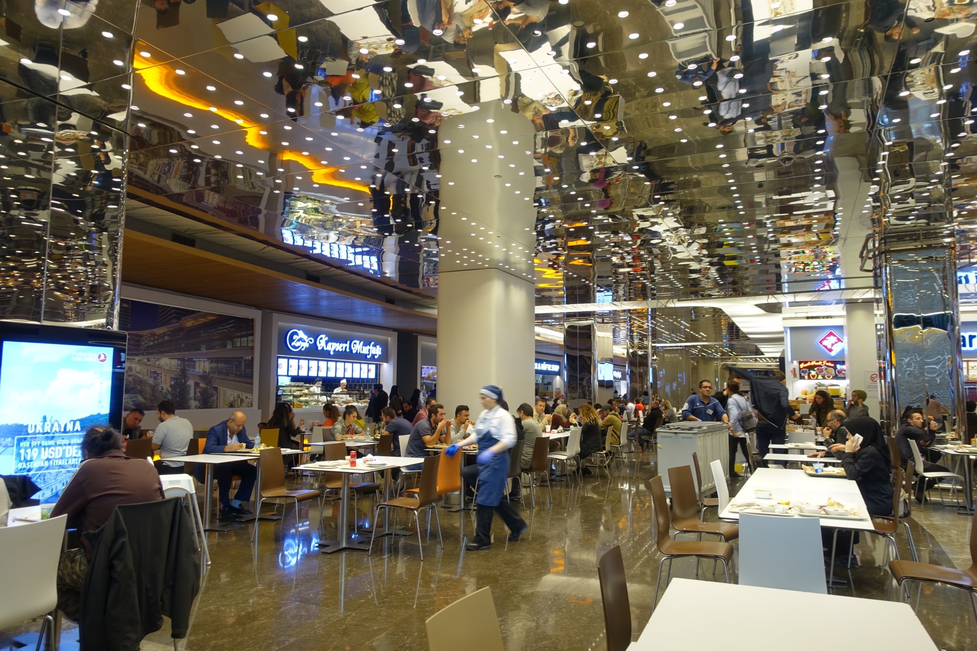 I centri commerciali sono parte integrante della vita turca. Siamo andati allo Zorlu Center, un centro commerciale molto moderno e di lusso con un’area ristorazione. Al piano terra ci sono alcuni ristoranti piuttosto raffinati, tra cui una steakhouse che è incredibile per la sua carne 😀 E il seminterrato è pieno di piccoli stand di fast food turco a buon mercato, che servono il pranzo agli impiegati nell’angolo. Questo centro commerciale è un po’ lontano dal nostro Airbnb quindi non ci andremo tutti i giorni, ma questo è l’aspetto della vera Istanbul (locale). Architettura sempre più moderna, molti centri commerciali
