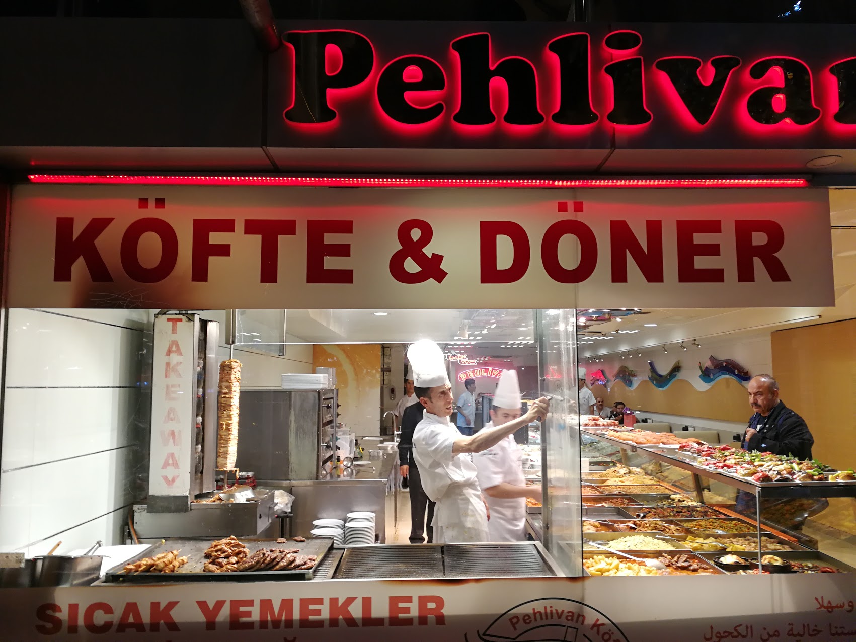 Poi andiamo tutti insieme al ristorante Pehlivan che vende piatti pronti. Il Köfte (polpette di carne) qui è molto buono. Il proprietario è originario della Macedonia, e ha iniziato aprendo un piccolo ristorante come questo, e infine ha aperto un 2°, 3°… Ce ne sono 5 in tutto nel quartiere. Ma non ce ne saranno sicuramente di più perché il proprietario vuole essere sicuro della qualità dei suoi ristoranti e non vuole fare il franchising. Questa catena è un po’ più costosa (2-3TL/flat) di altre dello stesso tipo, ma è anche molto più luminosa, pulita e piacevole. Soprattutto, offrono più scelta (di grigliate ma anche di dolci). Siamo rimasti lì per ore a parlare, senza essere cacciati dal ristorante loool 😀 Abbiamo pagato entro 7€ per due persone. Il tè turco è servito alla fine, gratuitamente
