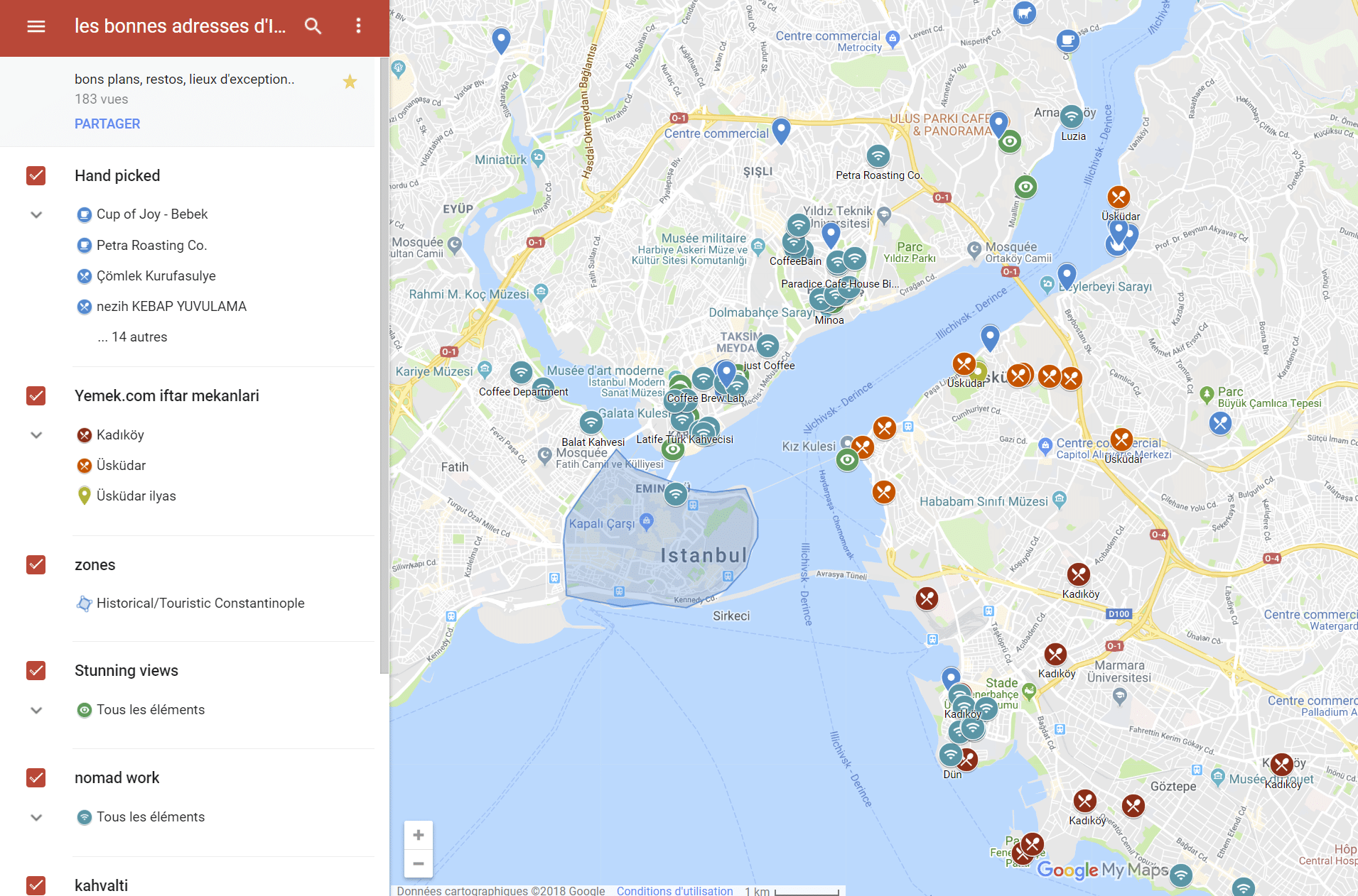 Questa mappa personalizzata, fornita gratuitamente da Kevin, nostro collega SEO e grande conoscitore di Istanbul (grazie mille!), vi permetterà di localizzare il meglio dei migliori ristoranti della città. Vi lascio controllare i prezzi su Internet perché è un mix di ristoranti di alta gamma e di bui locali. Questa mappa ti dà un’idea abbastanza buona della posizione ideale del tuo appartamento