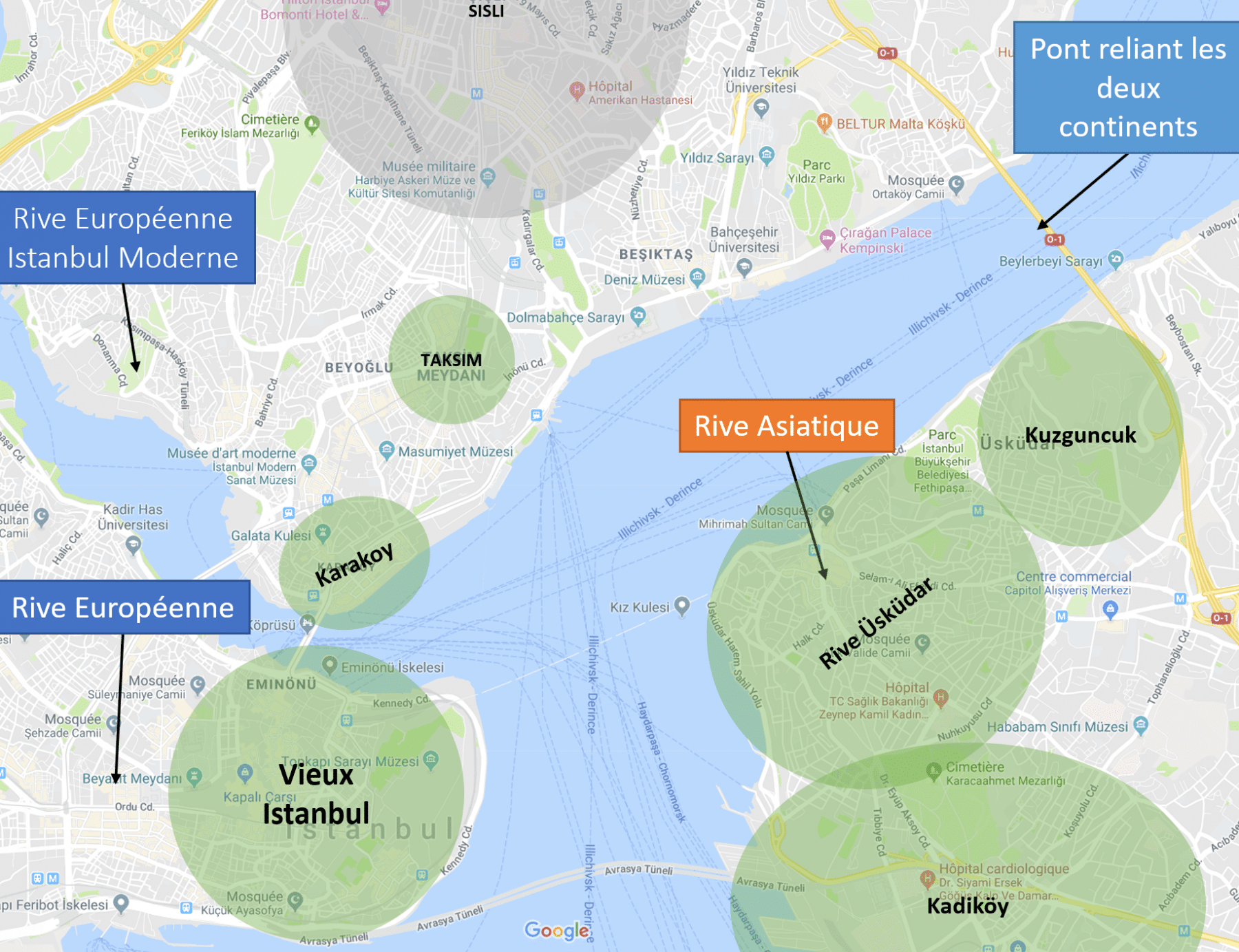 Molti turisti attraversano un ponte (Galata per la maggior parte) ed esclamano: sono in Asia, quando non è vero. Non è perché si attraversa un ponte che collega i due continenti. In questo caso, abbiamo due banche europee: la banca più vecchia, che raggruppa quartieri come Sultanahmet, Sirkeci… e una banca più moderna che raggruppa quartieri come Karakoy, Galata, Tophane, Taksim, Sisli… In Asia, Üskukar e Kadidoy si trovano proprio accanto al Bosforo, il che rende più facile il viaggio verso la città vecchia (in barca o in metropolitana)
