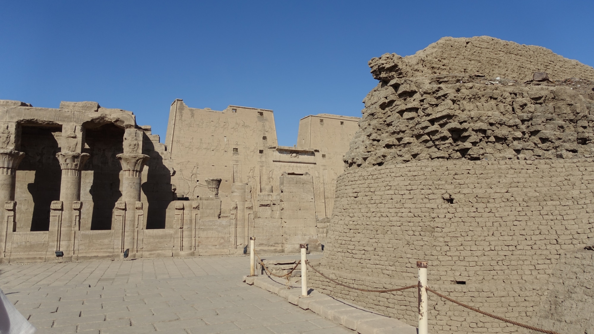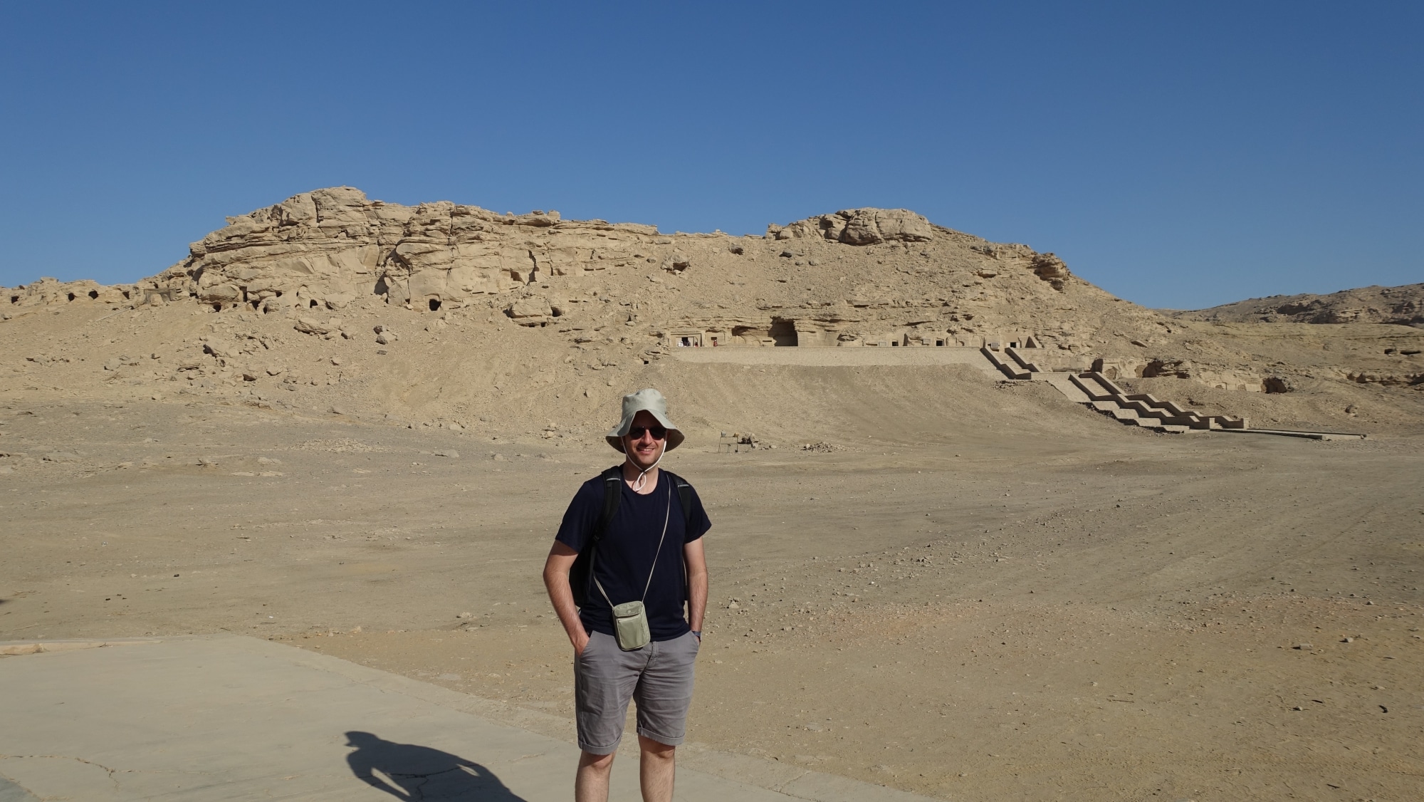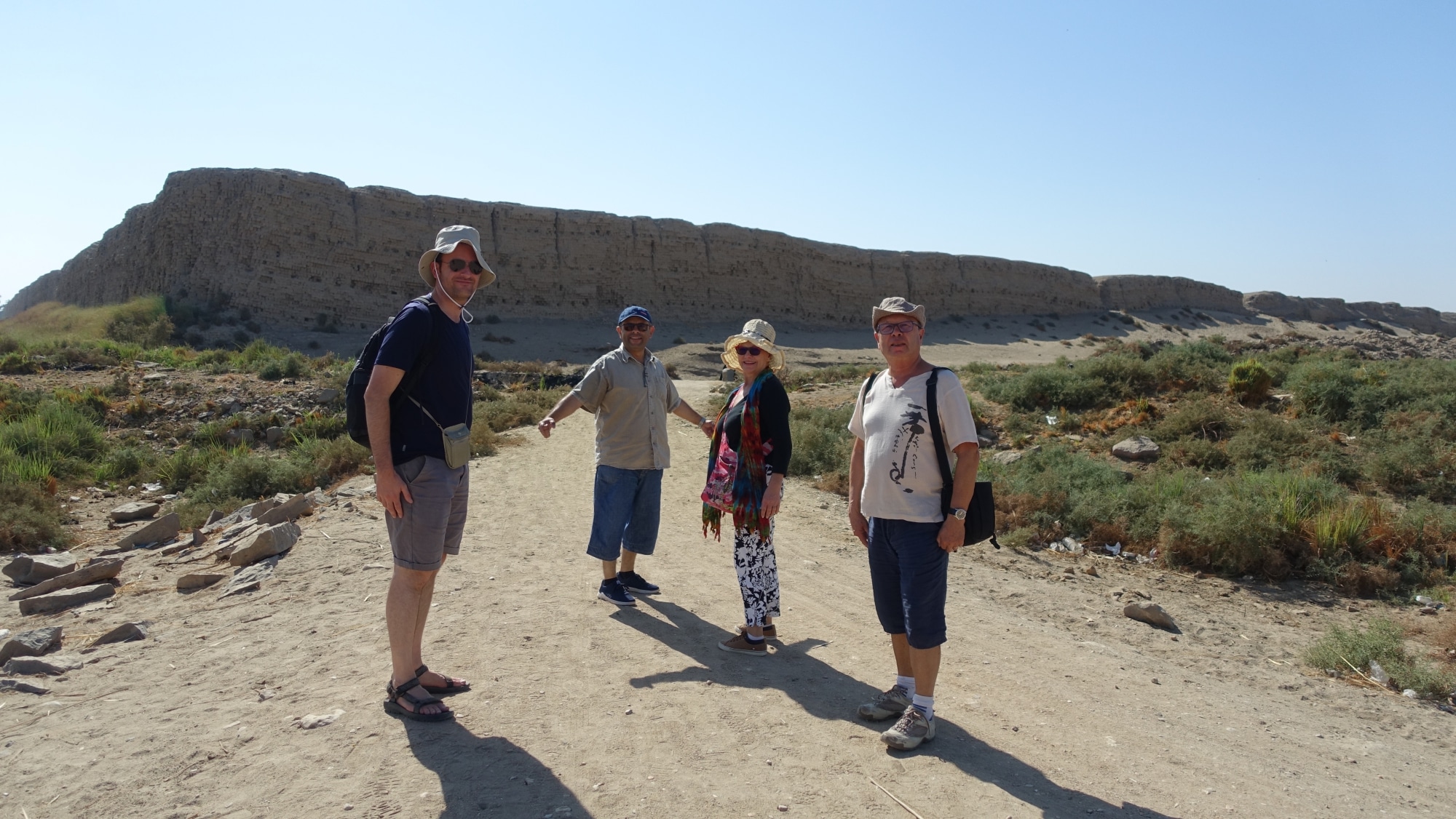 Si vedono enormi bastioni a forma di onda, che ricordano il mito della creazione del mondo (vedi spiegazione qui sotto). All’interno di questi bastioni c’è una città antica ma è chiusa ai turisti. foto (da sinistra a destra): JB, la nostra guida e i nostri compagni di viaggio, due pensionati di Nizza super simpatici, appassionati di Egitto. Siamo molto fortunati a viaggiare con loro perché tutti e tre emanano un’energia e un’aura incredibile