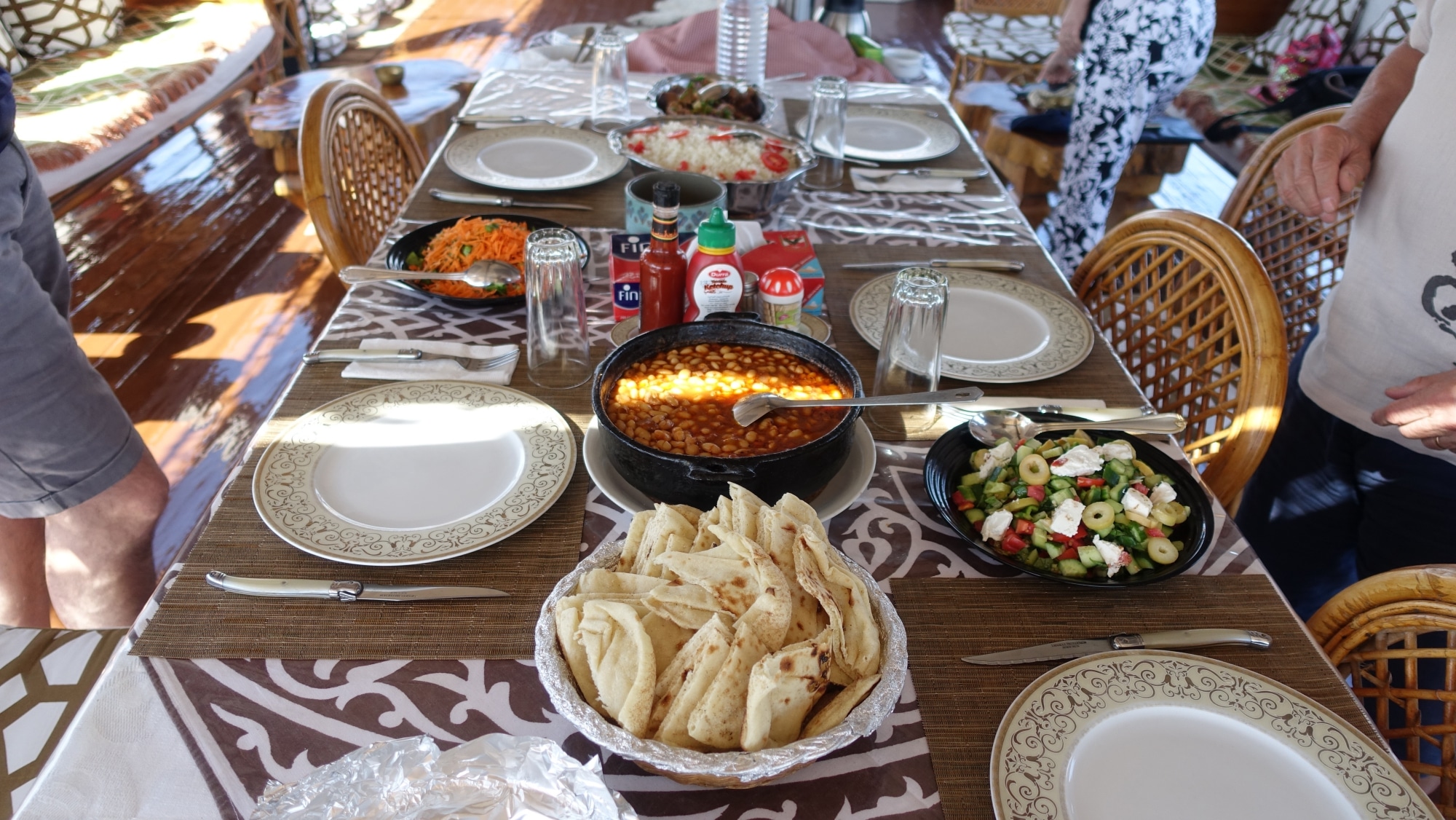 Si pranza sulla barca (c’è sempre una piccola zuppa all’inizio con miaaam al limone) e una moltitudine di piatti + dessert. È una delizia!