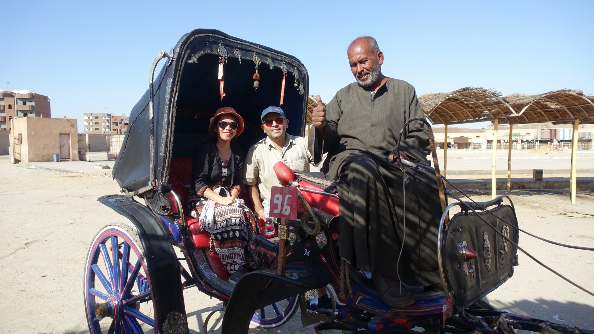 Prendiamo una carrozza trainata da cavalli (che ci aspetta già sulla banchina – che organizzazione!) per andare al tempio (200 sterline andata e ritorno ma già incluse nel nostro tour). Nella foto, sono con la nostra guida Bassem