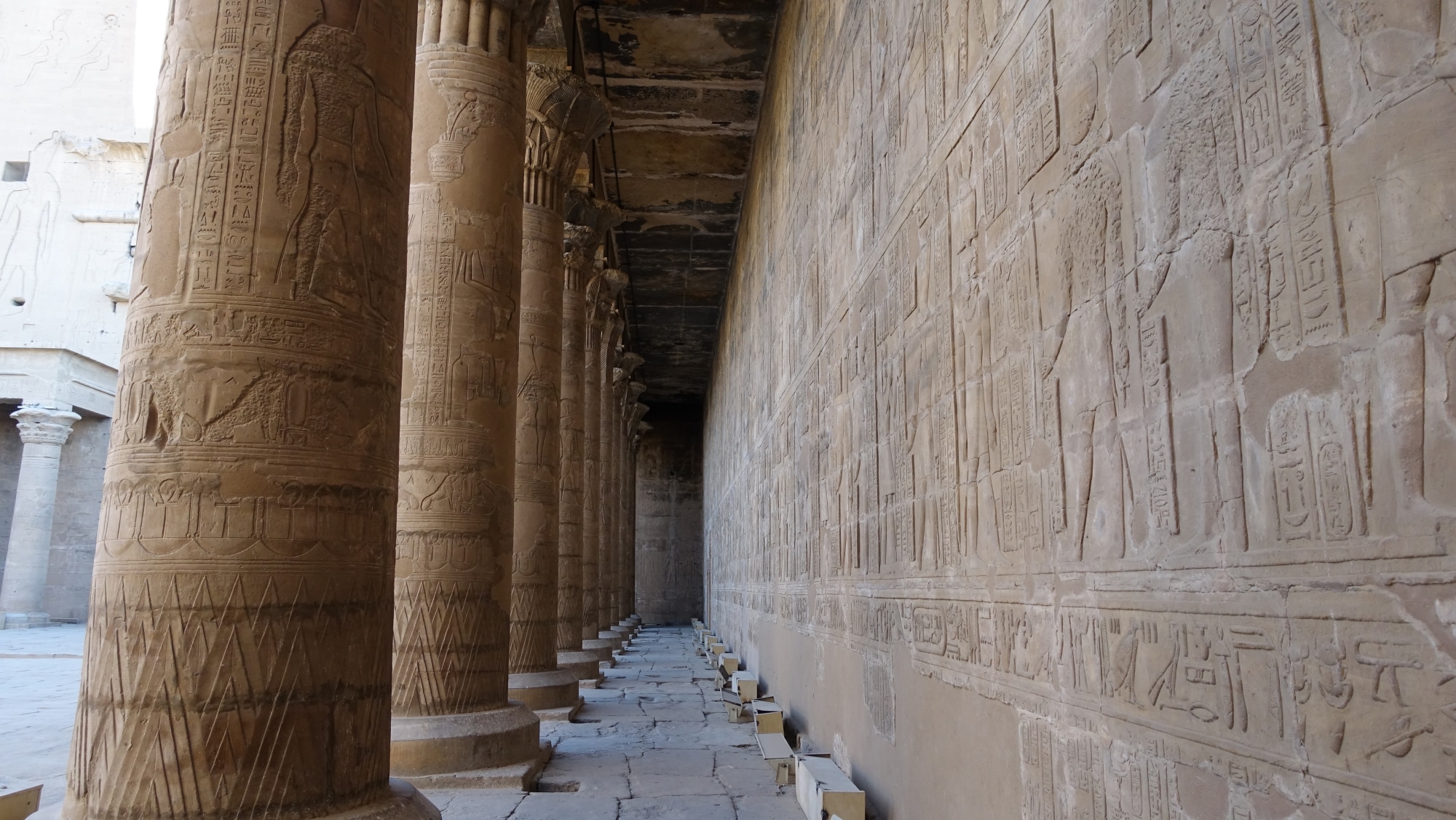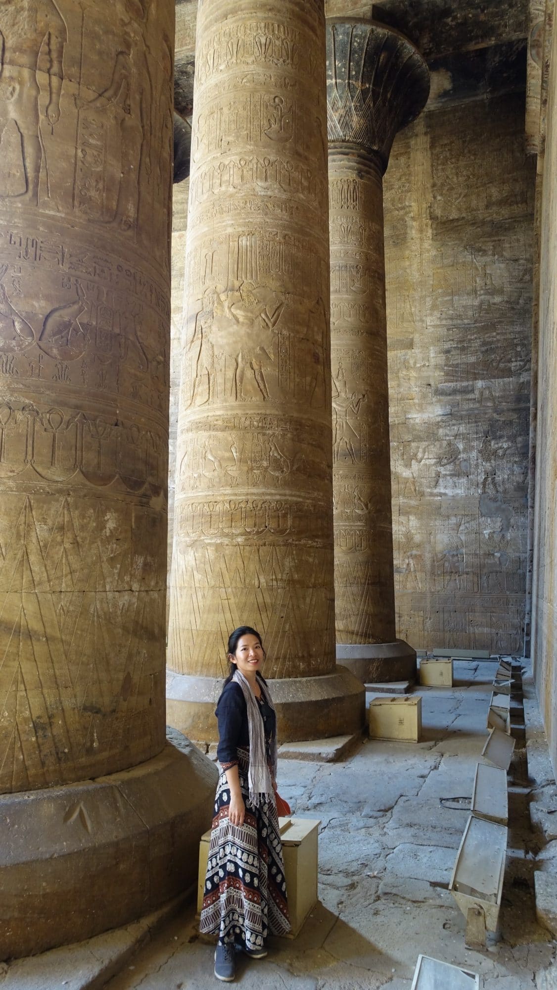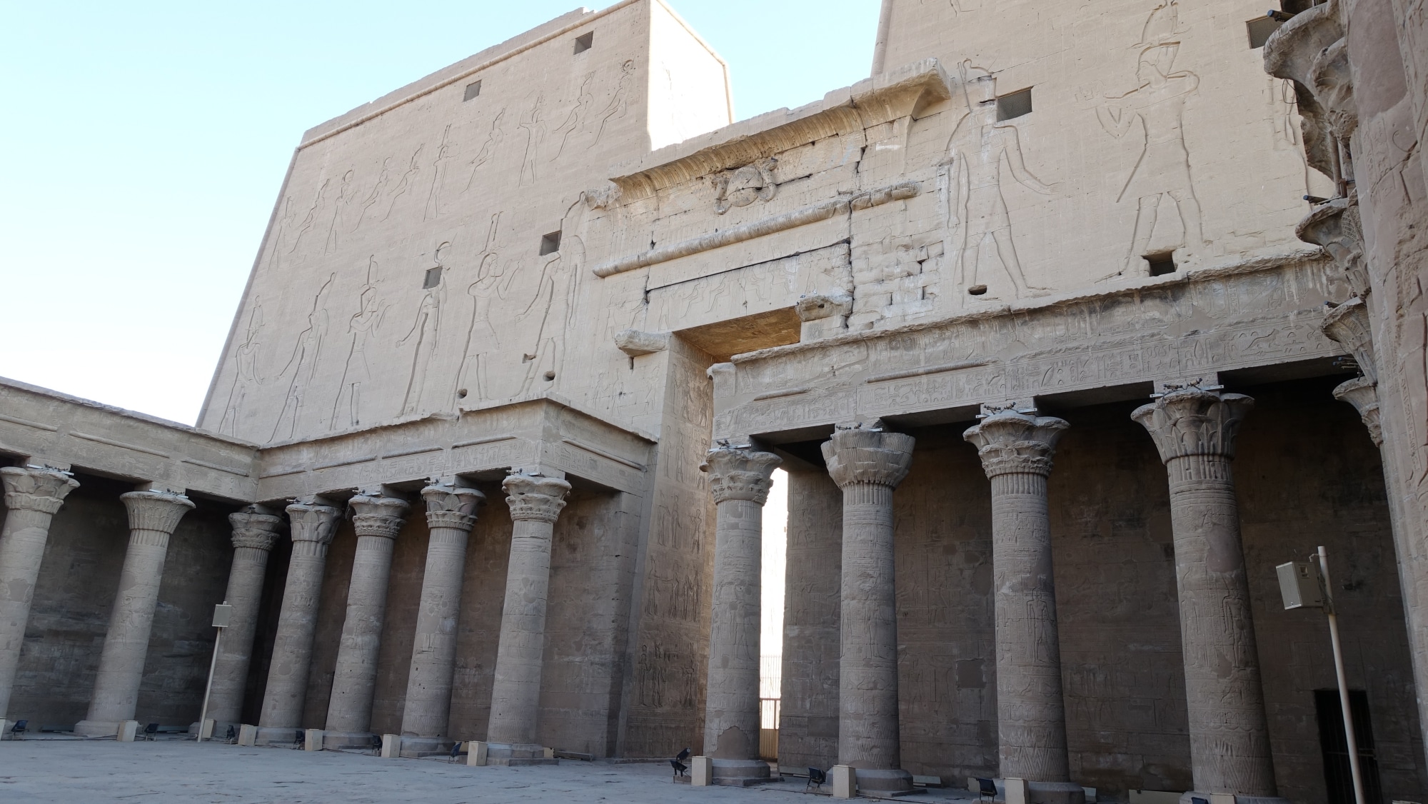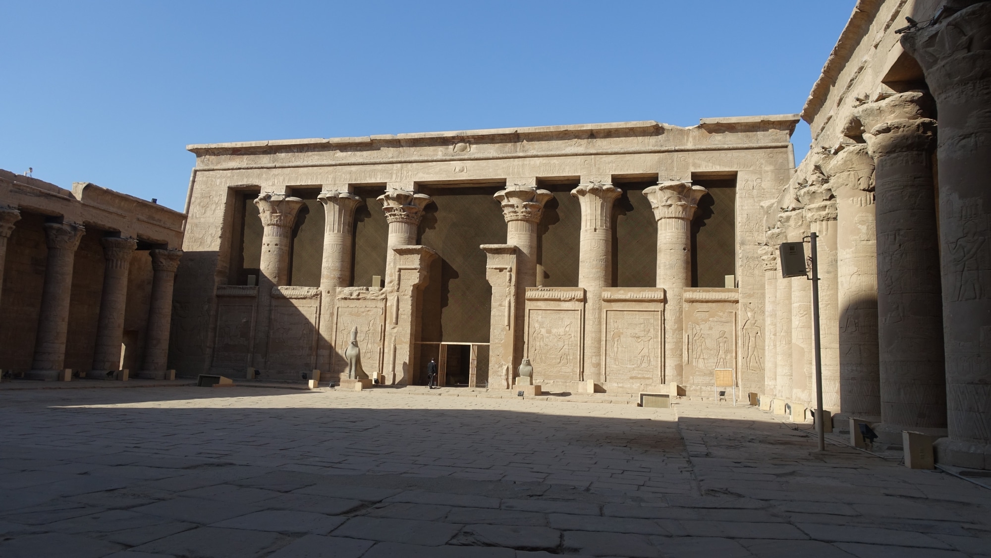 Usciamo attraverso il grande cortile, il tempio si sta affollando. Siamo così privilegiati di aver avuto un tempio così bello e occupato solo per noi per un bel po’ di tempo. Sono sopraffatto dalla bellezza di questo tempio. E grazie al suo eccellente stato di conservazione, ci dà una migliore comprensione della struttura tipica di un tempio egiziano e una migliore immagine del tempio Karnak e del tempio di Luxor nel loro stato originale