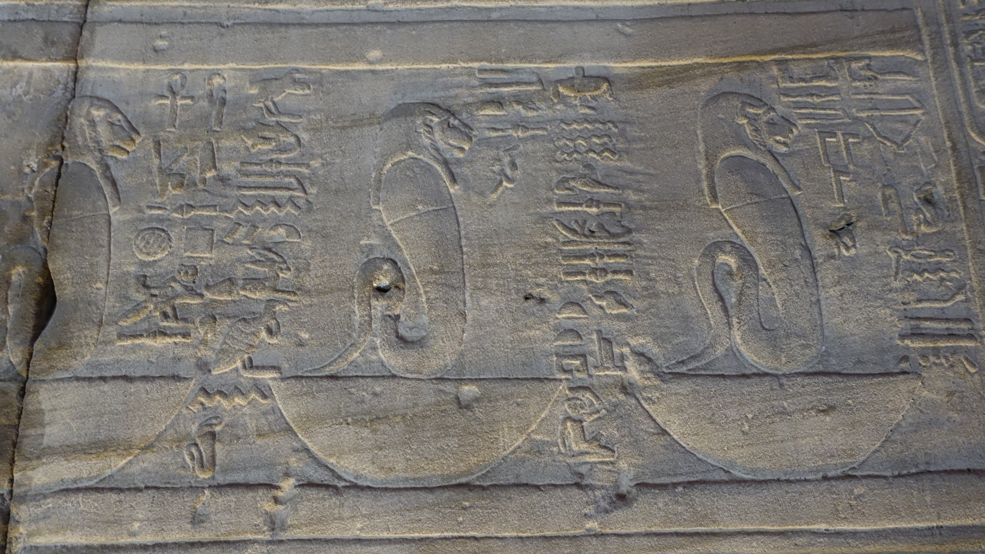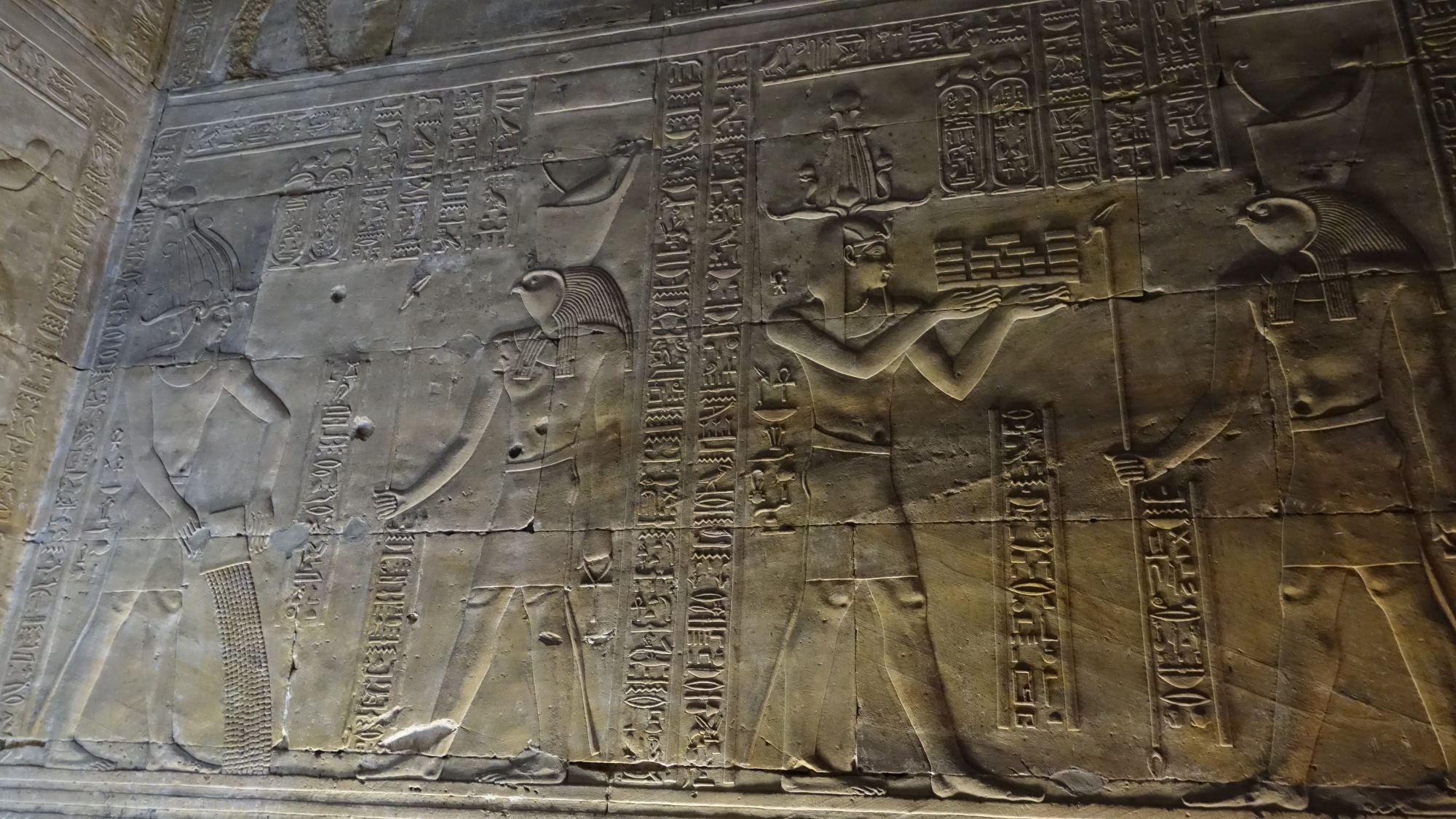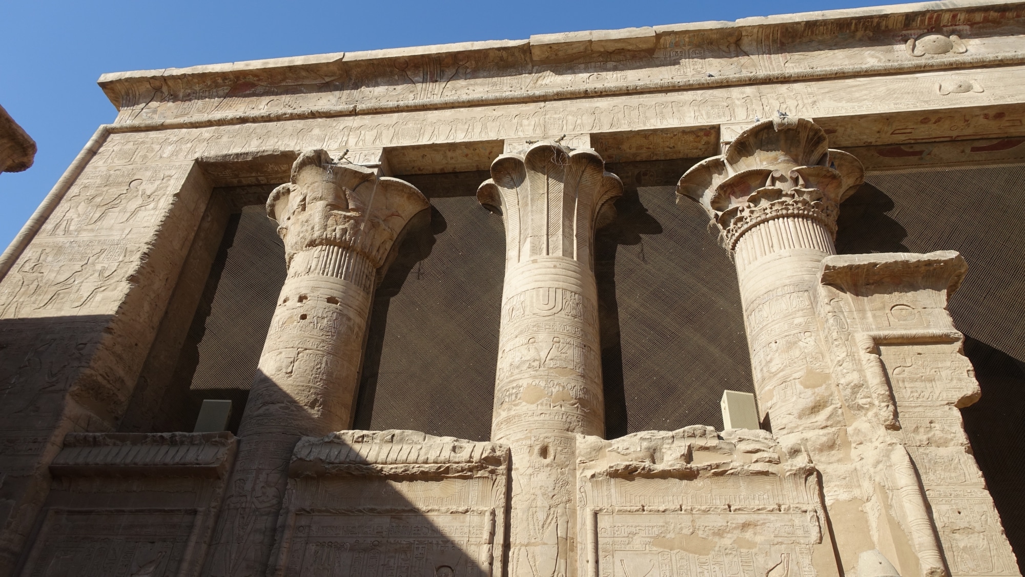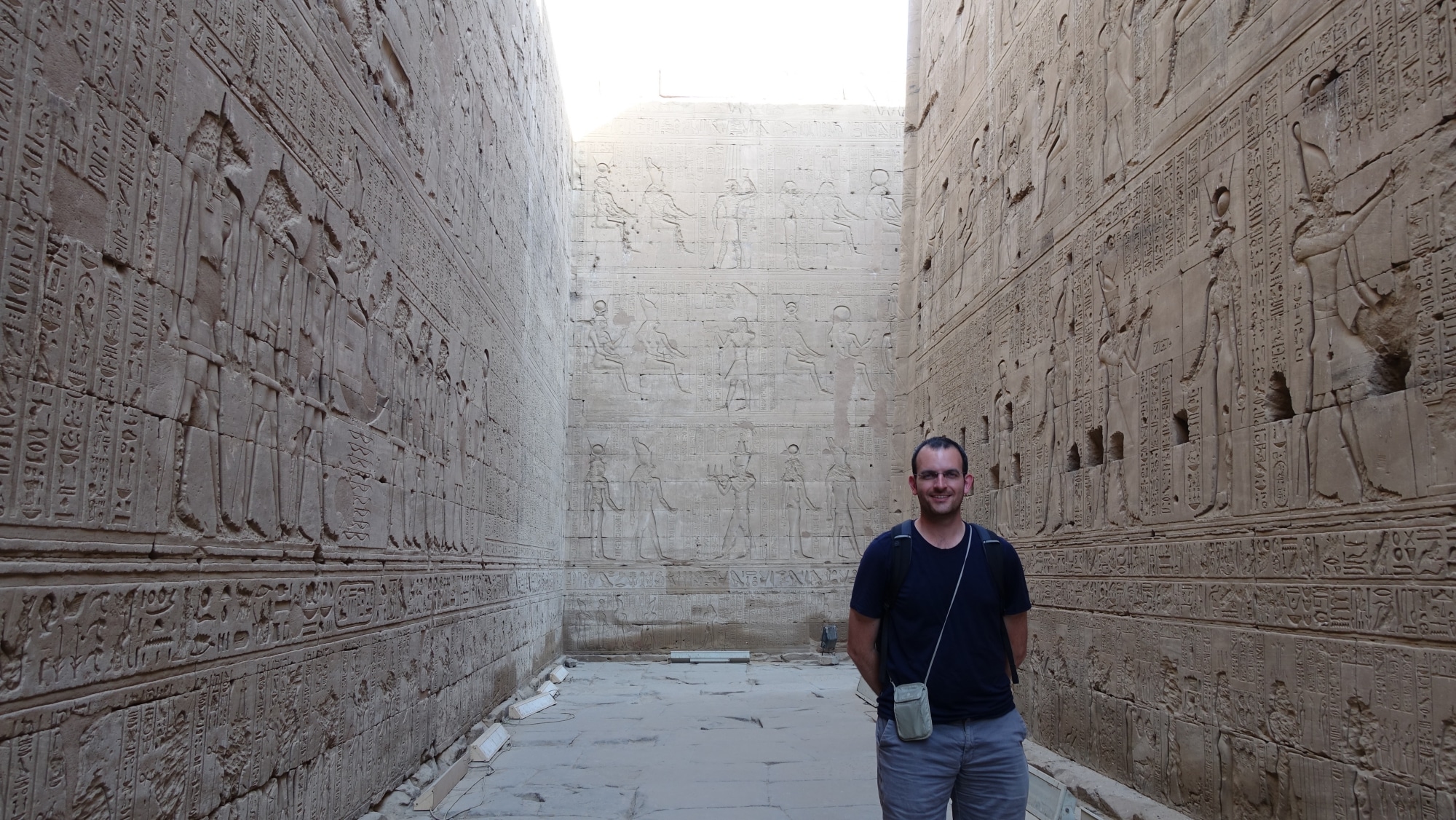Ed ecco il tempio di Edfu, dedicato al dio falco Horus. Guarda, non c’è nessuno in giro! Il massimo del lusso! Guarda come sono enormi i modelli e i disegni. E soprattutto, ben conservato! Questo tempio si è conservato grazie alle tempeste di sabbia che lo hanno sepolto sotto diversi metri di sabbia