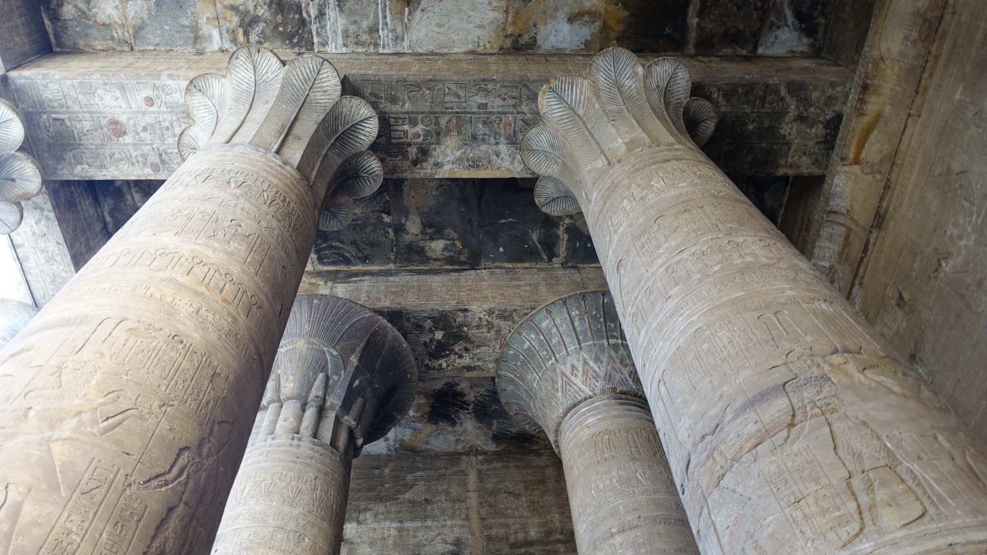 E dentro, ohlala, è incredibile! Enormi colonne ci aspettano, con un tetto (purtroppo tutto nero a causa dei copti che volevano danneggiare il posto)