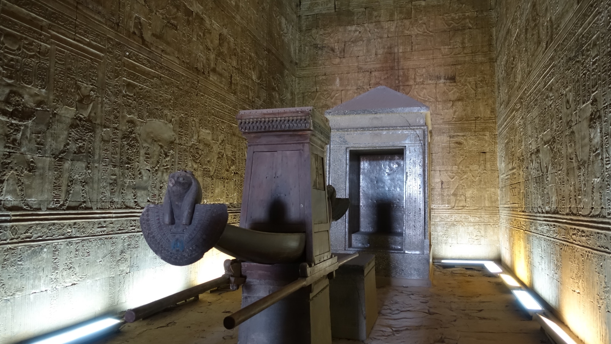 All’interno, vediamo scene del faraone che chiede il permesso a Dio di costruire un tempio e la convalida della sua ubicazione, fino alle offerte agli dei, la barca portata dai sacerdoti… alcune scene riecheggiano quelle viste al tempio karnak. Molte rappresentazioni del faraone sono state prese a martellate dai copti, che volevano vendicarsi. Hanno martellato così tanto che a un certo punto si sono stufati e hanno preferito coprire i motivi. Così, grazie alla sabbia che nascondeva una parte + la pigrizia dei copti, alcuni disegni non sono stati martellati. Uff!