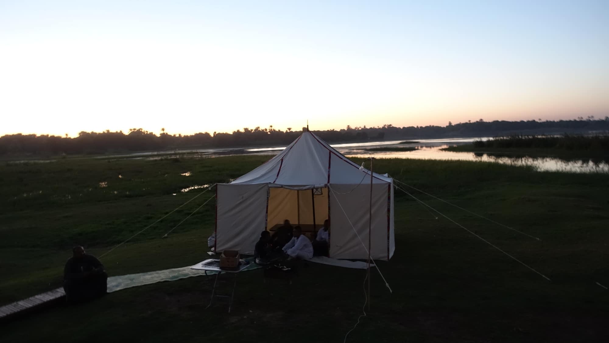 Ceniamo nella tenda (cena reale come al solito) e tutto l’equipaggio viene a suonare musica nubiana ed egiziana (alle percussioni) e balliamo insieme. Altri dahabiya fanno la stessa cosa ma senza la tenda, perché non sarebbero stati in grado di sistemare una dozzina di ospiti in una tenda. In questo caso, si cena all’esterno su delle sedie, ma è anche molto bello