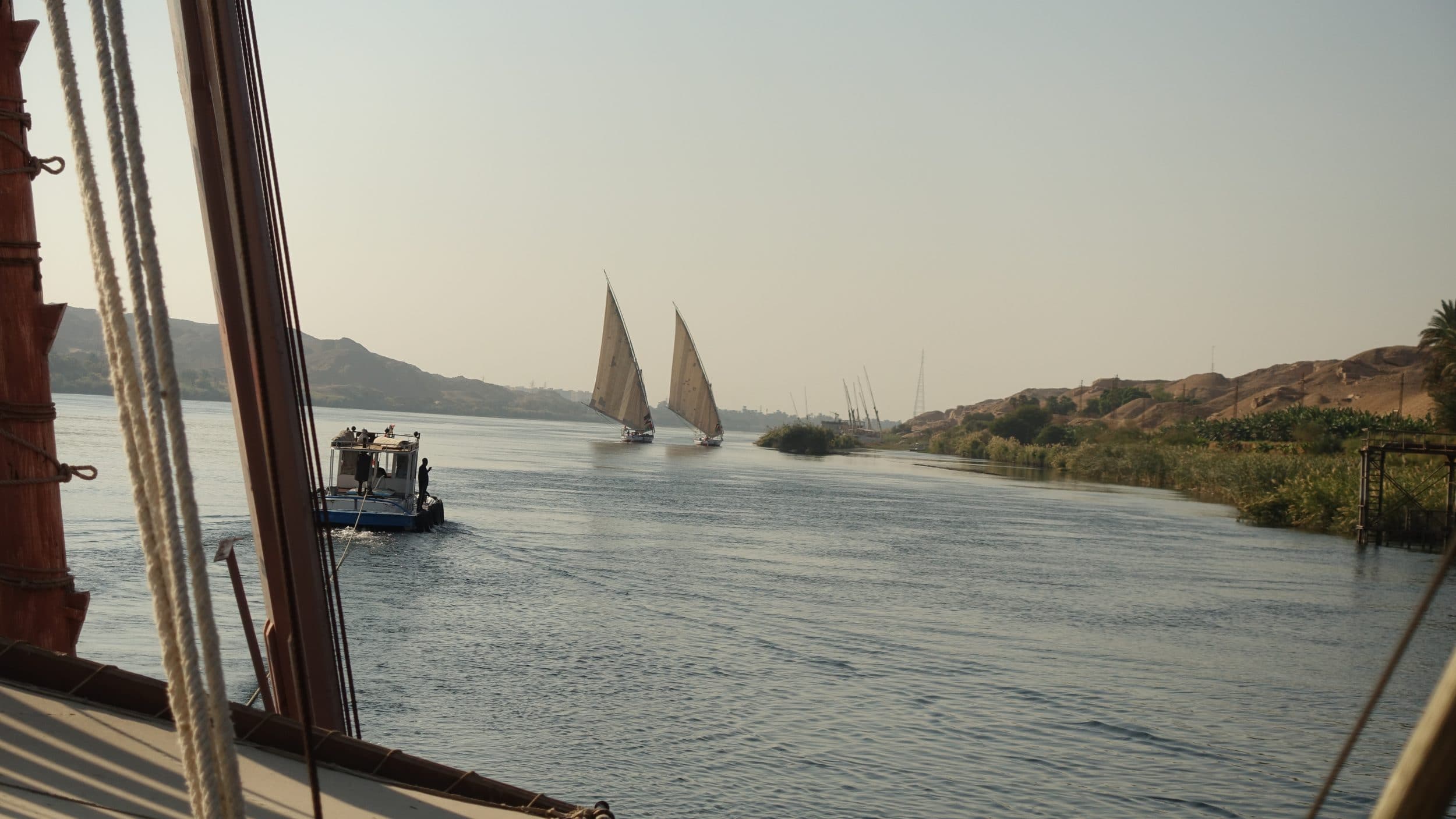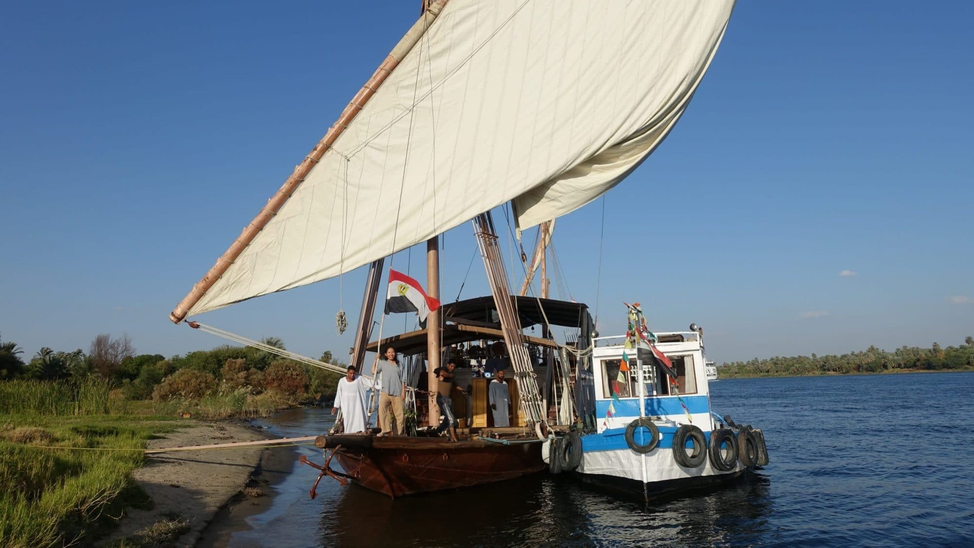 Molto spesso, quando una grande nave da crociera passa troppo vicino a una dahabiya in piena vela, il suo rimorchiatore corre a tutta velocità tra la barca e la dahabiya, pronto a intervenire in qualsiasi momento