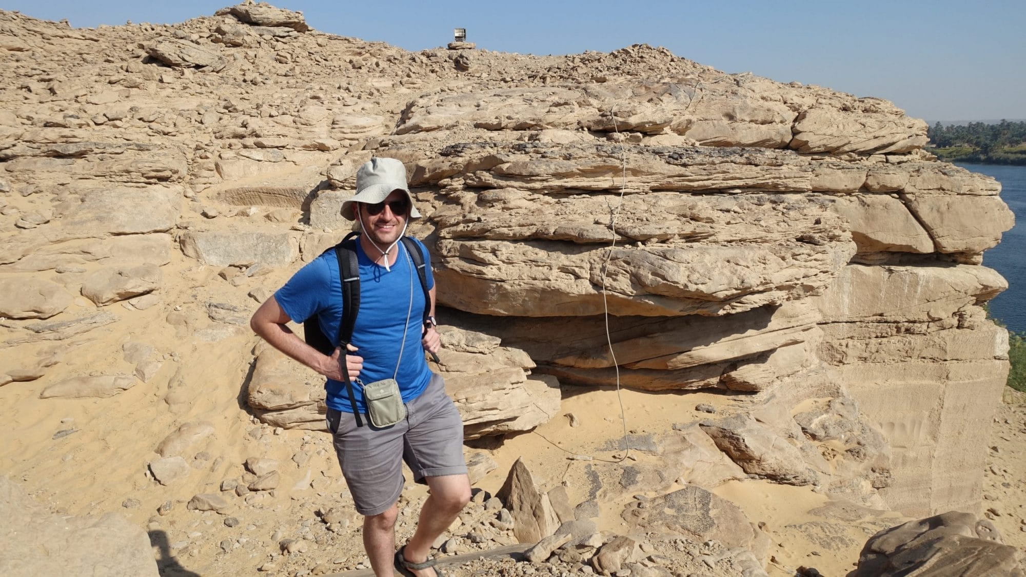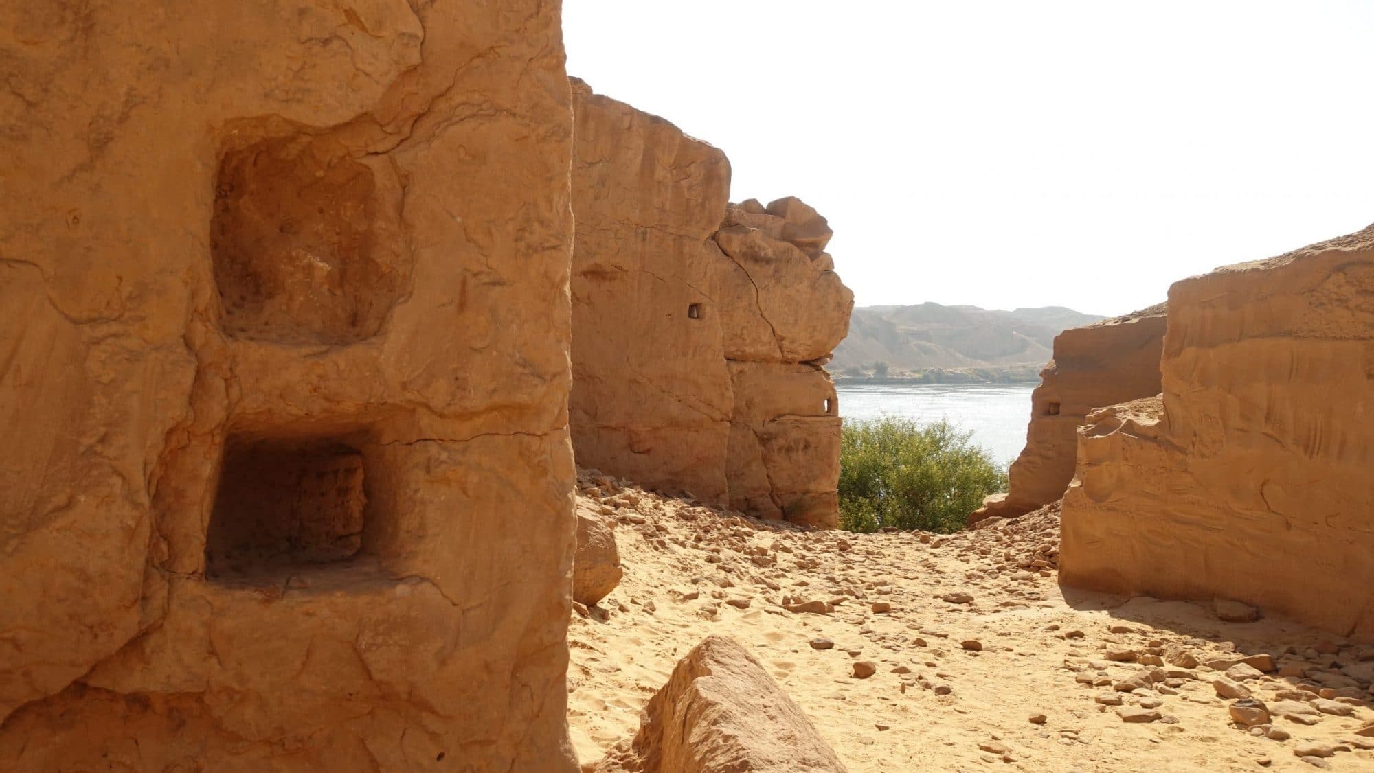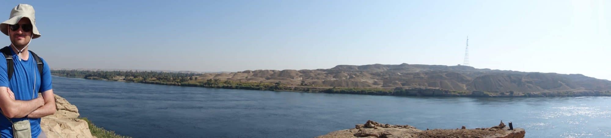 Siamo invitati a salire in cima. Da qui, possiamo effettivamente vedere che il Nilo è molto stretto (poche centinaia di metri di larghezza contro il solito 1 km). Quando l’acqua del Nilo sale fortemente, la corrente è molto forte, ma questo passaggio è così stretto che l’acqua è costretta a “calmarsi” un po’. Questo ricorda il mito della Dea lontana