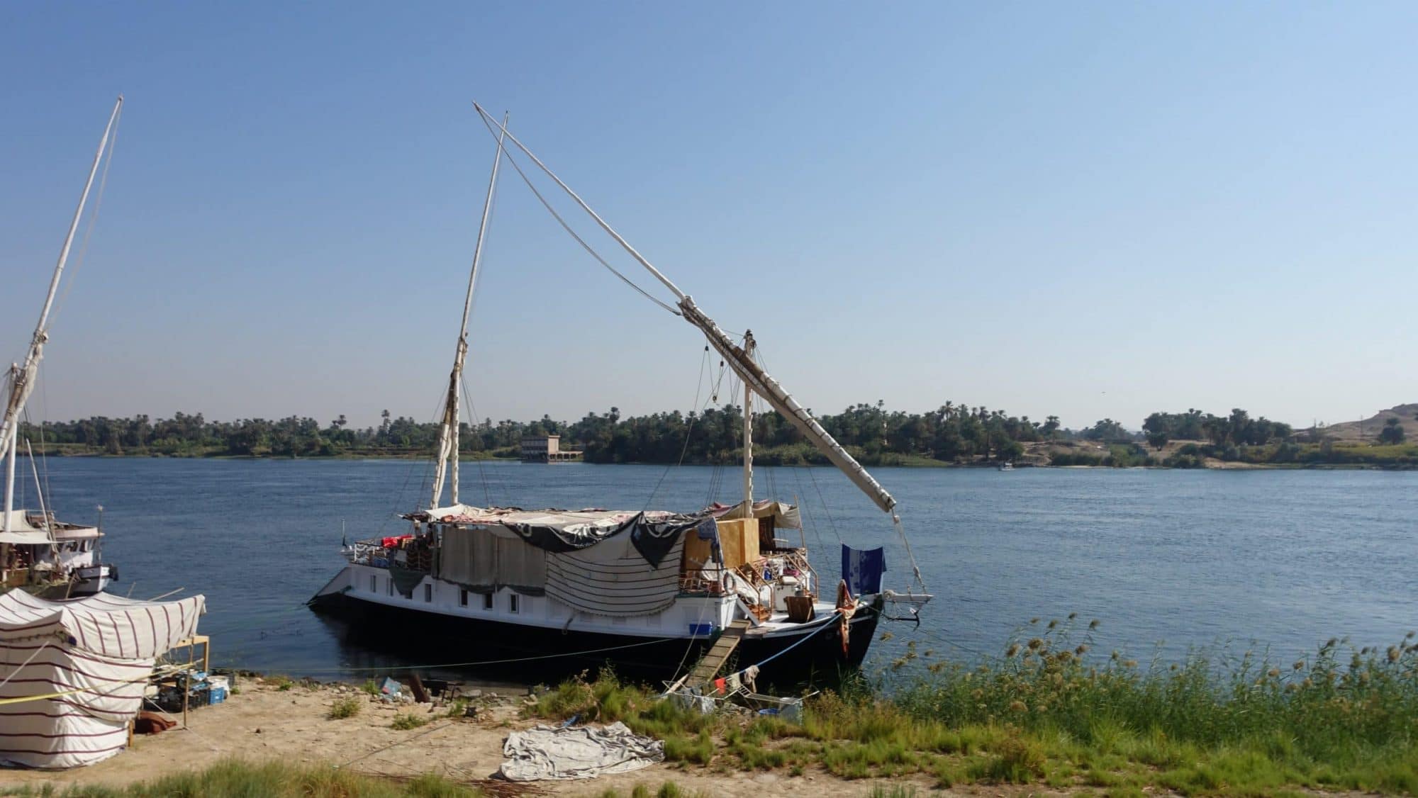 In lontananza vediamo due magnifiche feluche, che non si fermano nel nostro stesso posto, ma che contribuiscono fortemente alla bellezza del luogo e all’idea che abbiamo di una crociera sul Nilo (ce ne sono meno a causa della diminuzione del turismo, proprio come le dahabiya e le navi da crociera). È come un sogno. Non c’è molto vento oggi e segretamente spero che ce ne sia abbastanza per navigare come ieri