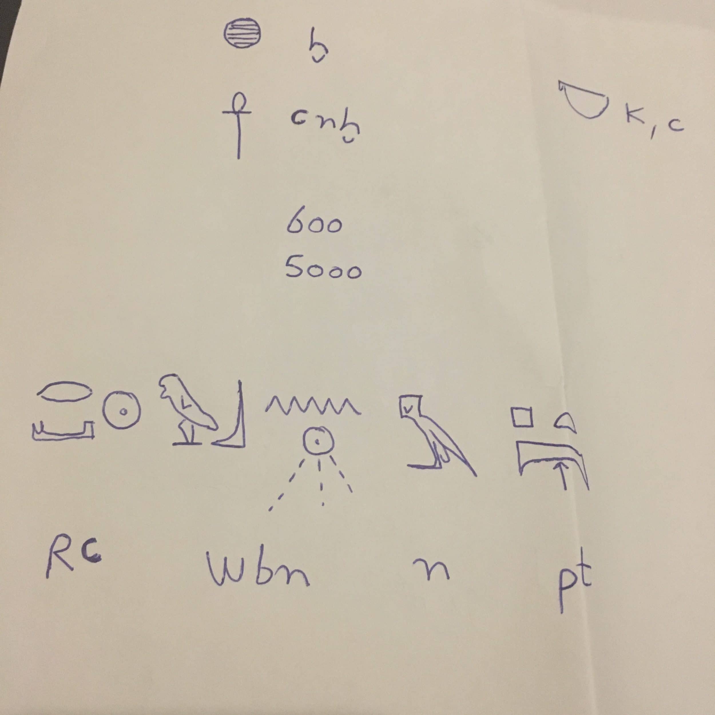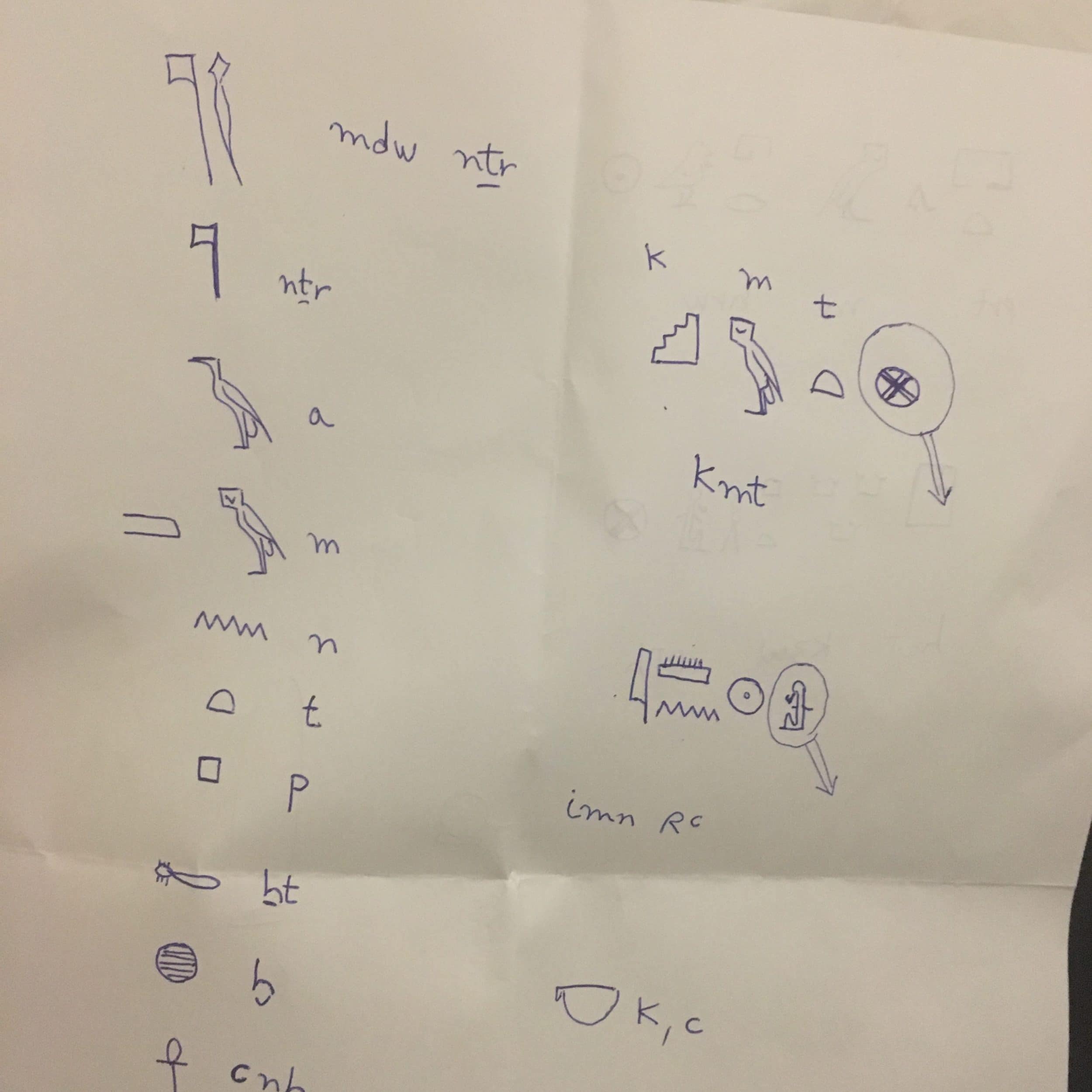 Quindi, è possibile, se si è lavorato almeno 2 anni sui geroglifici, riconoscere i segni (ci sono 5000 segni) e saper leggere ad alta voce i geroglifici, ma capire il significato… è molto più lavoro! In ogni caso, grazie a questo mini corso, il giorno dopo, siamo stati in grado di riconoscere un bel po’ di segni, anche se non ne capiamo il significato. E poi, quando volevamo copiare la lezione di Bassem, ci siamo resi conto che dovevamo anche imparare a disegnare i segni, per esempio il gufo, il falco, l’anatra ecc. in entrambe le direzioni in più, perché a volte il falco gira a sinistra, e a volte gira a destra