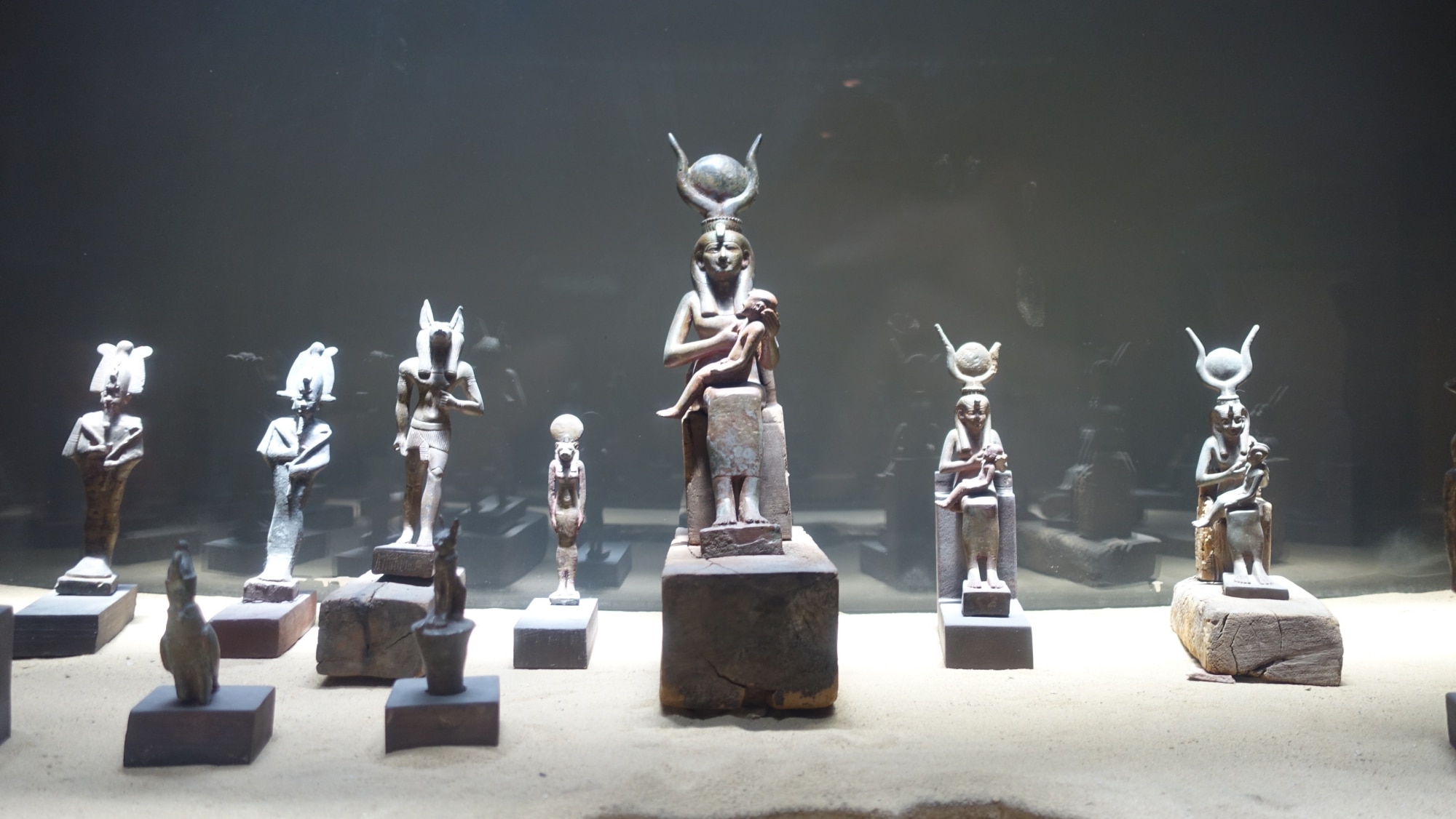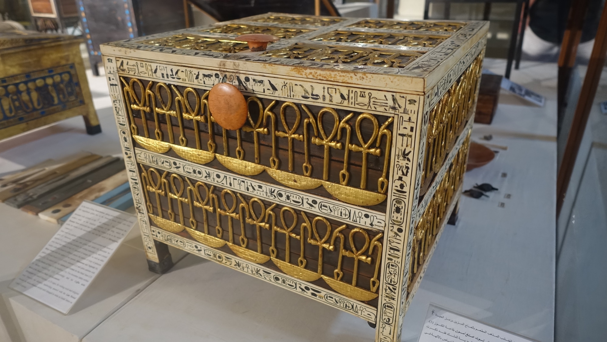 Siamo al primo piano, nell’ala degli oggetti trovati nella tomba di Tutankhamon. È un giovane faraone, solo 10 anni di regno, la sua tomba è molto piccola, ma è l’unica che è stata trovata intatta nella Valle dei Re quindi è di grande valore per gli egittologi. Inoltre, il faraone è morto all’improvviso quindi molti oggetti sono stati probabilmente presi dal palazzo (oggetti d’oro) mentre per gli altri faraoni, hanno nella loro tomba una copia, ma economica, dei loro oggetti quotidiani.