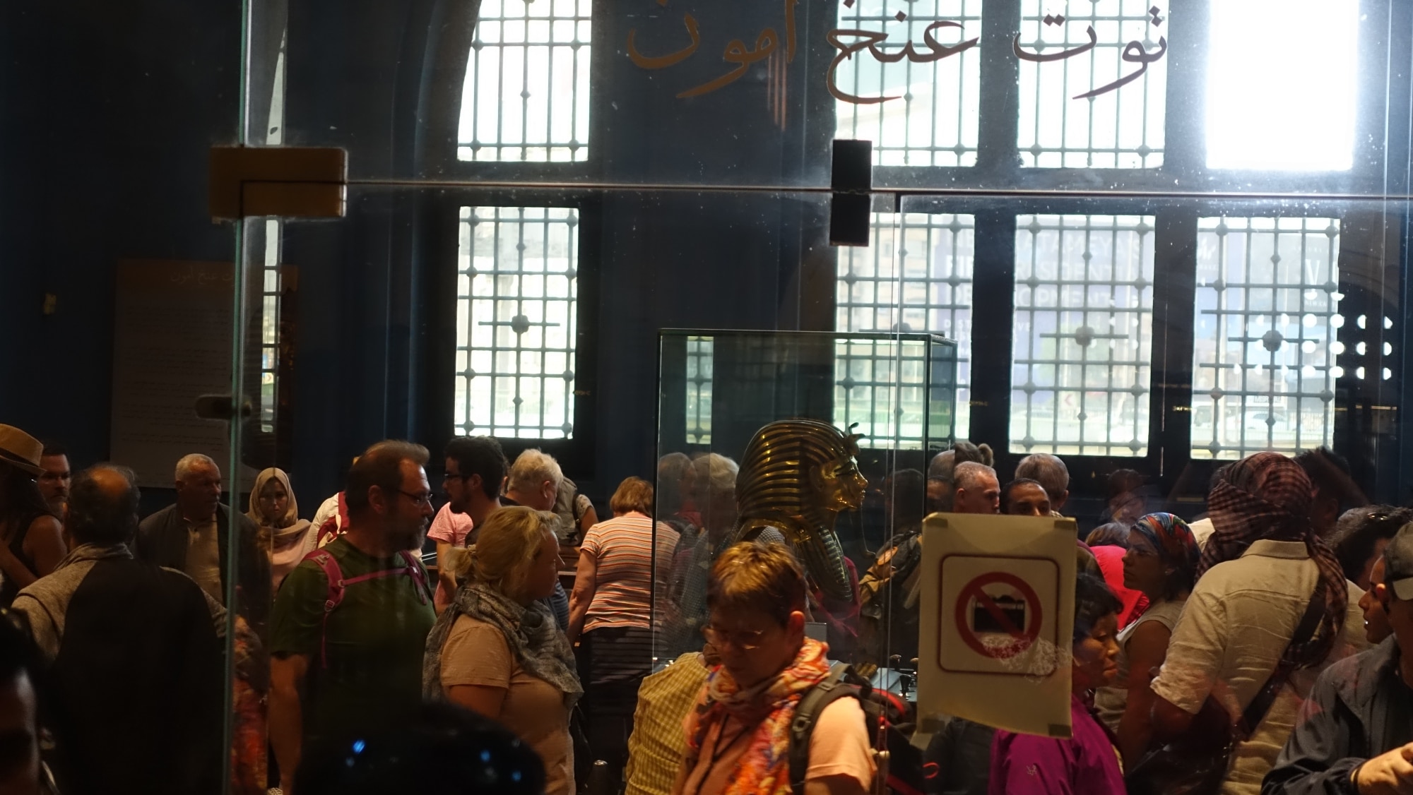 Questa è la stanza del tesoro di Tutankhamon, si può fotografare l’esterno ma non l’interno. Ci sono bare d’oro. Abbiamo assistito alla mostra di Tutankhamon a Parigi, con copie dei suoi tesori, ma non è la stessa cosa degli oggetti reali esposti qui. Le bare sono incrostate di pietre preziose, e anche la maschera, sono senza parole! È un capolavoro.