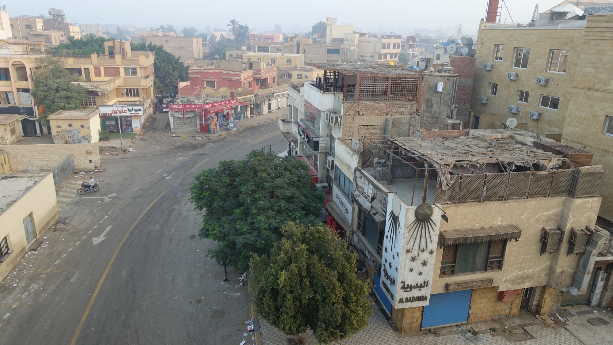 Quando si gira la testa a destra, si vede questo. Pizza Hut guarda direttamente la sfinge. Penso che sia il Pizza Hut con la migliore vista del pianeta. Vedete il quartiere, non c’è niente di strano, e vi risparmio l’odore. Puzza di merda di cavallo appena esci per strada, perché un sacco di cavalli e cammelli “lavorano” qui intorno per portare i turisti a fare un giro sulle dune. Sto sfatando il mito che le piramidi sono nel deserto, eh. Sì, erano nel deserto, ma la città venne da loro.
