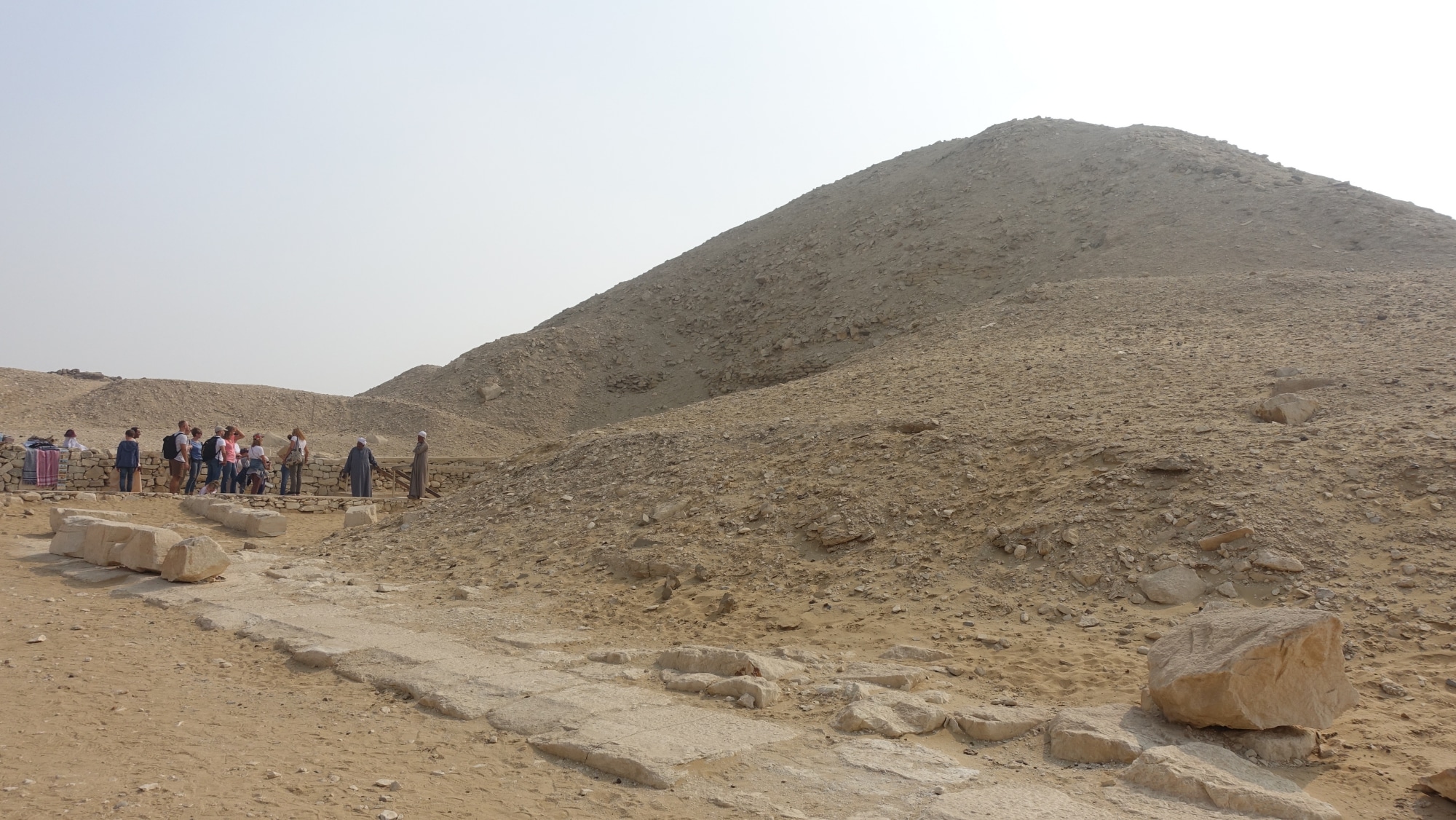 Ecco la piccola piramide, quasi crollata, che andremo a visitare. Questa è una vera tomba, è fatta di pietre più piccole, la tecnica è chiaramente meno avanzata (non sta più in piedi) e c’è solo un corridoio che porta al fondo, dove hanno trovato un sarcofago, una mummia e alcuni mobili (visibili nel museo del Cairo). Ci sono ancora dei disegni sul muro.