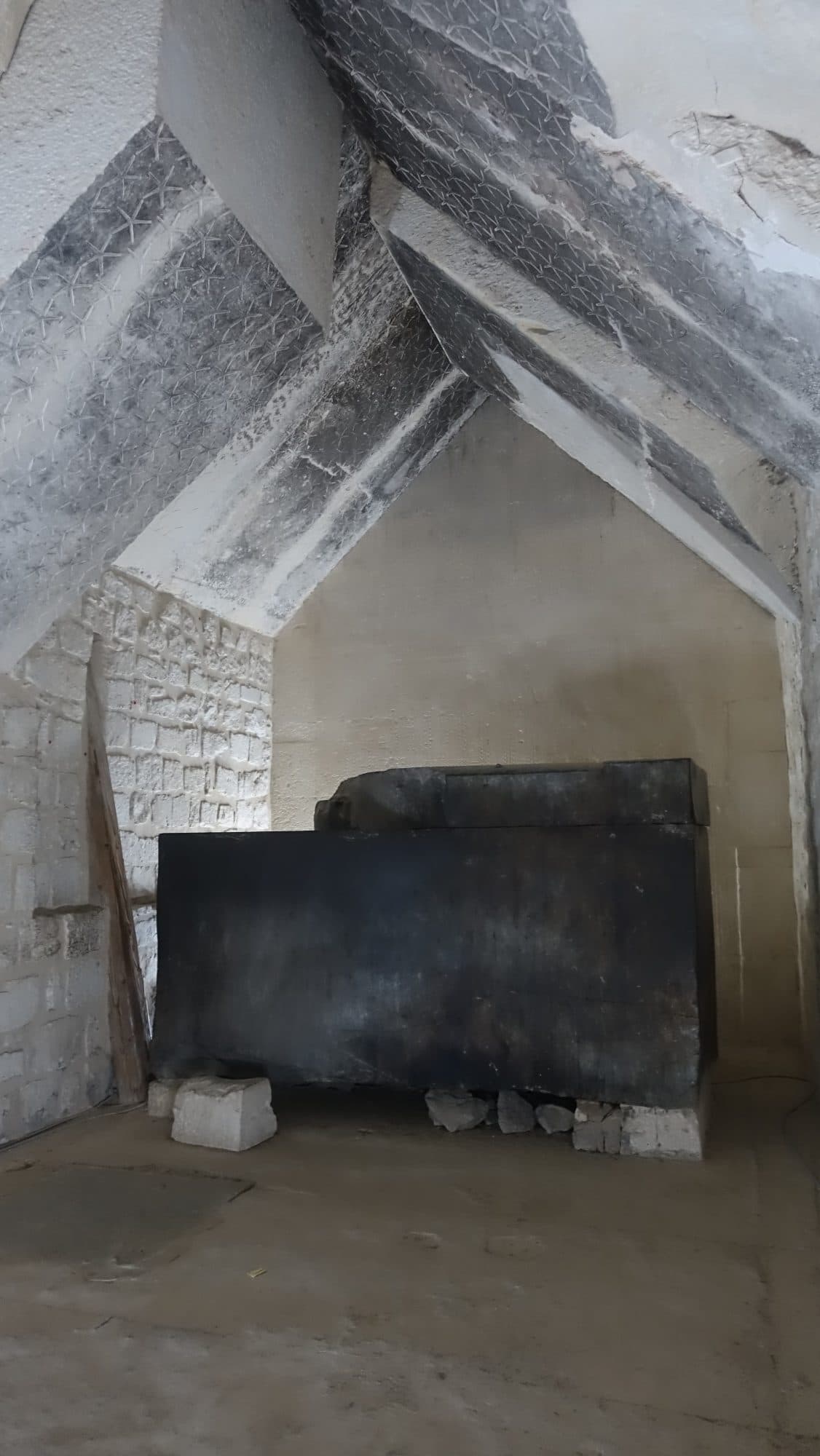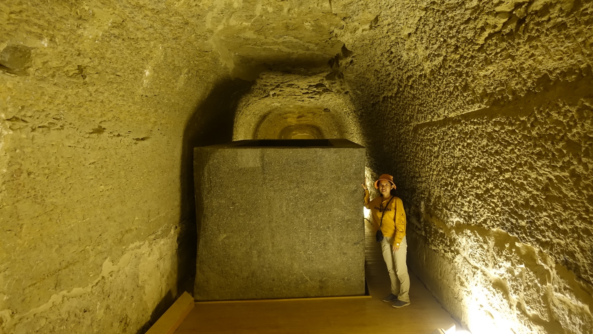 Il corridoio in basso è chiuso, e ci è permesso solo di salire, prima attraverso un corridoio stretto (dobbiamo piegarci), poi un corridoio più largo (possiamo stare in piedi) ma entrambi salgono asciutti. Alla fine, ci pieghiamo di nuovo per passare attraverso uno stretto passaggio ed entrare nella stanza che chiamano “Camera del Re”, fatta di granito. Contrariamente alle altre piramidi, questa camera ha un soffitto piatto (nelle altre piramidi, è a triangolo, una successione di pietre che crea una specie di volta). C’è un “sarcofago” in fondo alla camera, possiamo vedere un buco a destra, sulla parete, un altro buco dove ora c’è un ventilatore. Non so se è la mancanza di ossigeno, ma sento il peso della piramide intorno a me, l’aria pesante, un eccesso di qualcosa. È una sensazione strana, non so come descriverla. Non mi sento né bene né male.
