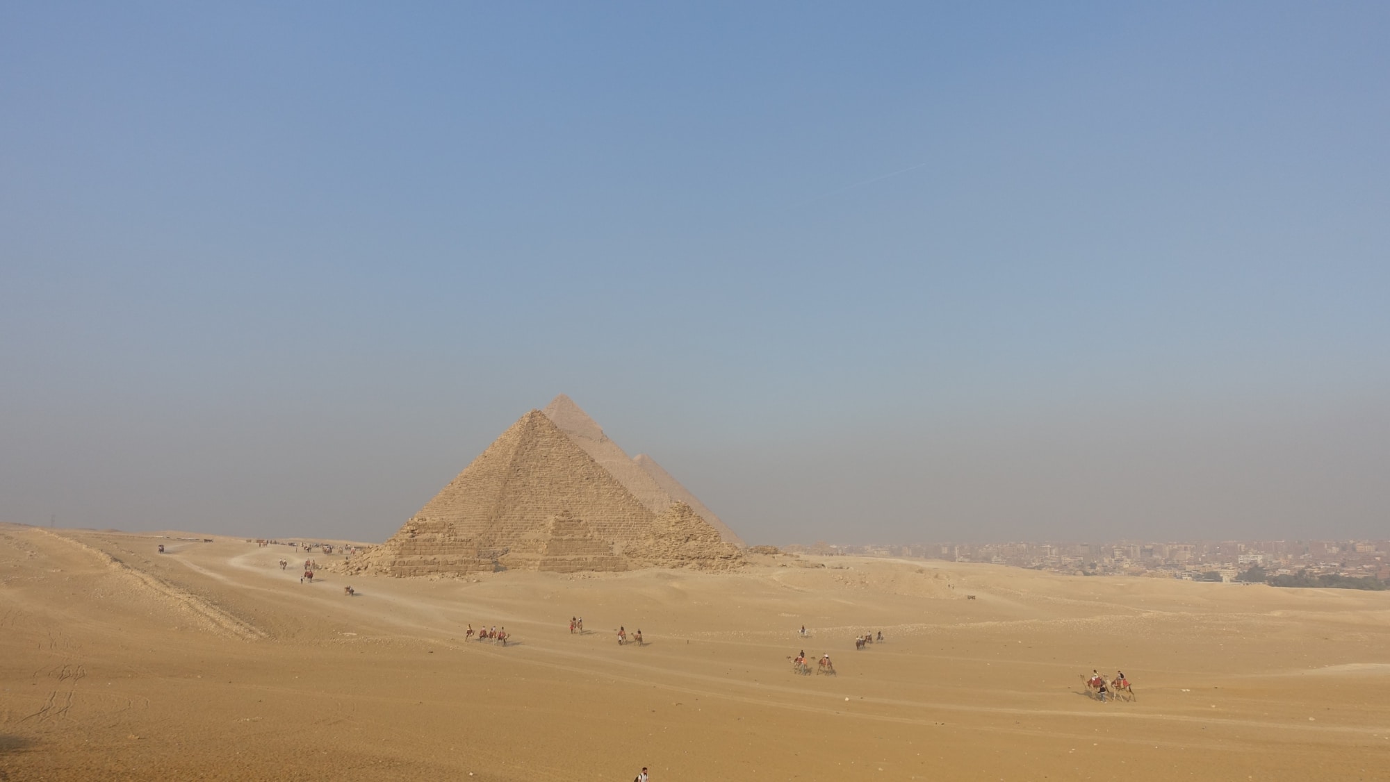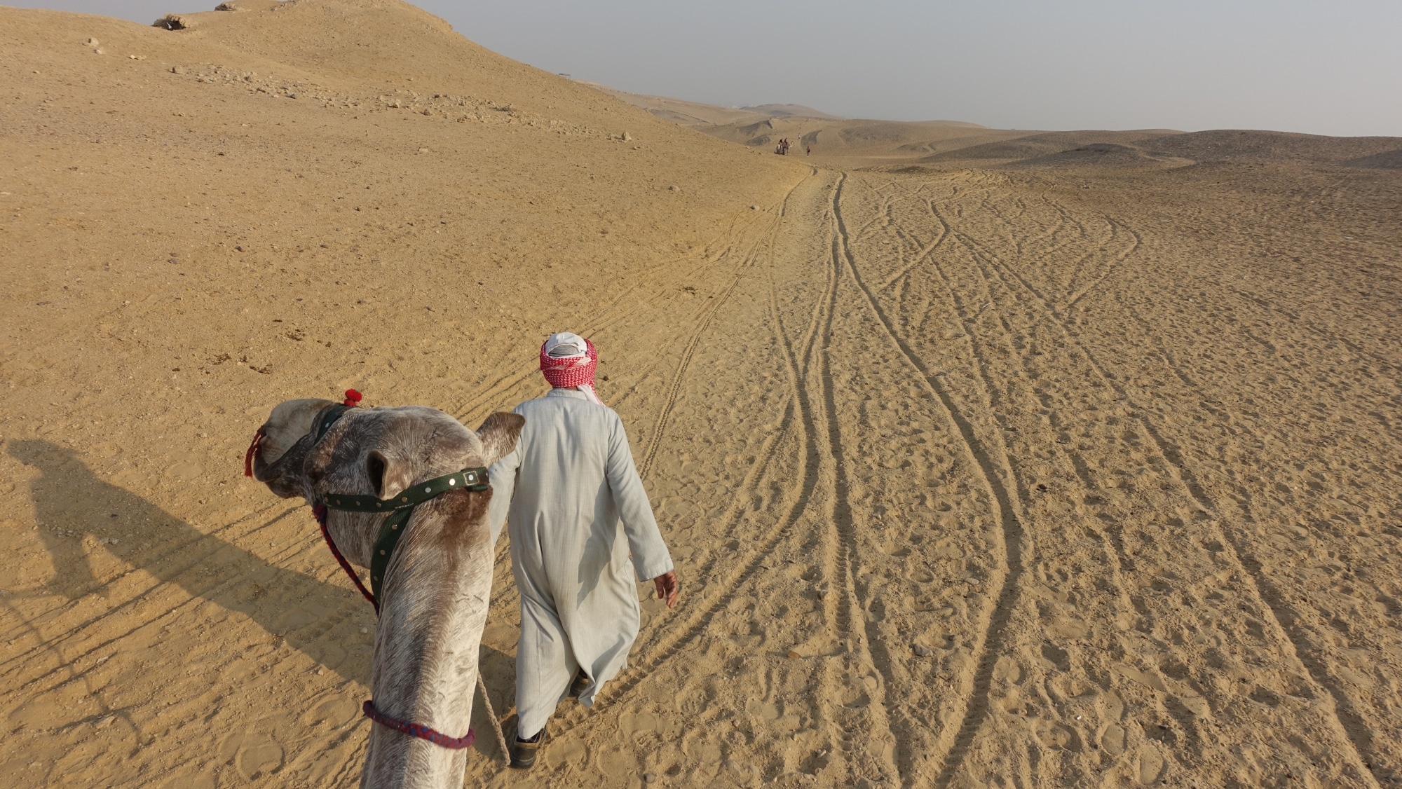 Pranziamo proprio vicino a Saqqarah e poi torniamo a Giza per il nostro giro in cammello. Fortunatamente per noi, la nebbia è sparita. Guardate la piramide, come si vede bene la cima rispetto a questa mattina.
