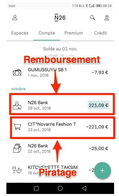 Quando eravamo in Turchia, ho avuto la sgradevole sorpresa di essere addebitato con un pagamento fatto in India. La mia carta n26 è stata violata! Per un importo di 221,09 € tutto uguale!