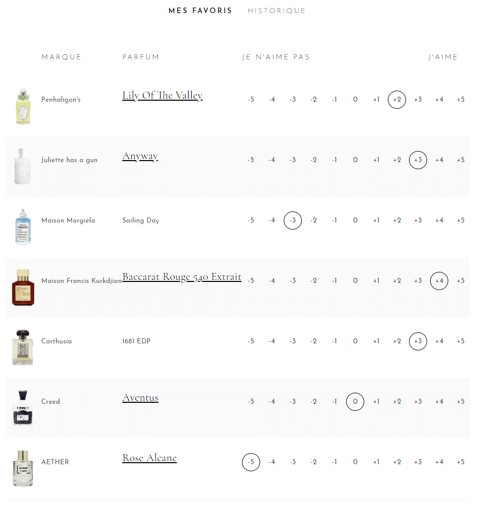 Lo strumento mi porta immediatamente una lista delle note che mi piacciono, basata sulla lista delle mie fragranze.