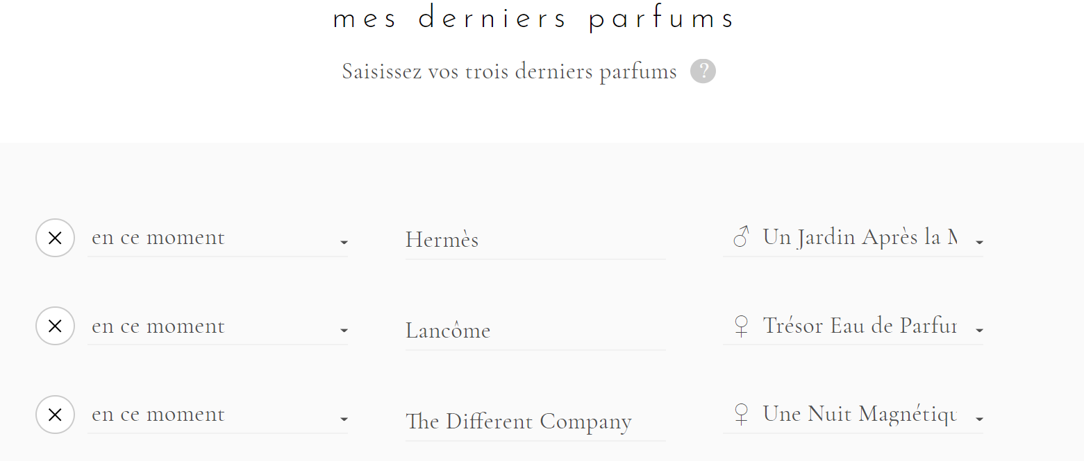 Devi inserire i profumi che hai indossato, che stai indossando… Se non hai mai indossato un profumo, c’è una casella da spuntare se ne hai bisogno. La lista non è esaustiva, ma si possono comunque trovare un sacco di profumi (9000!!).