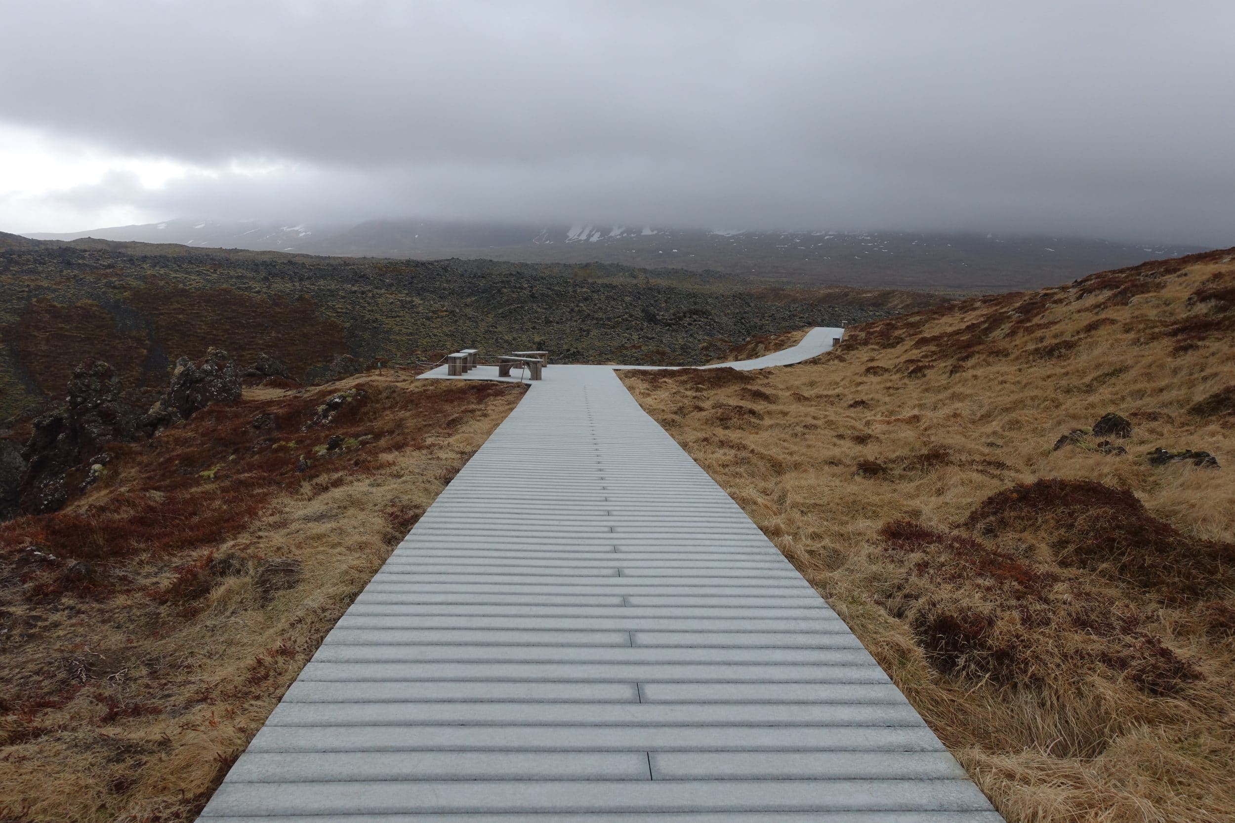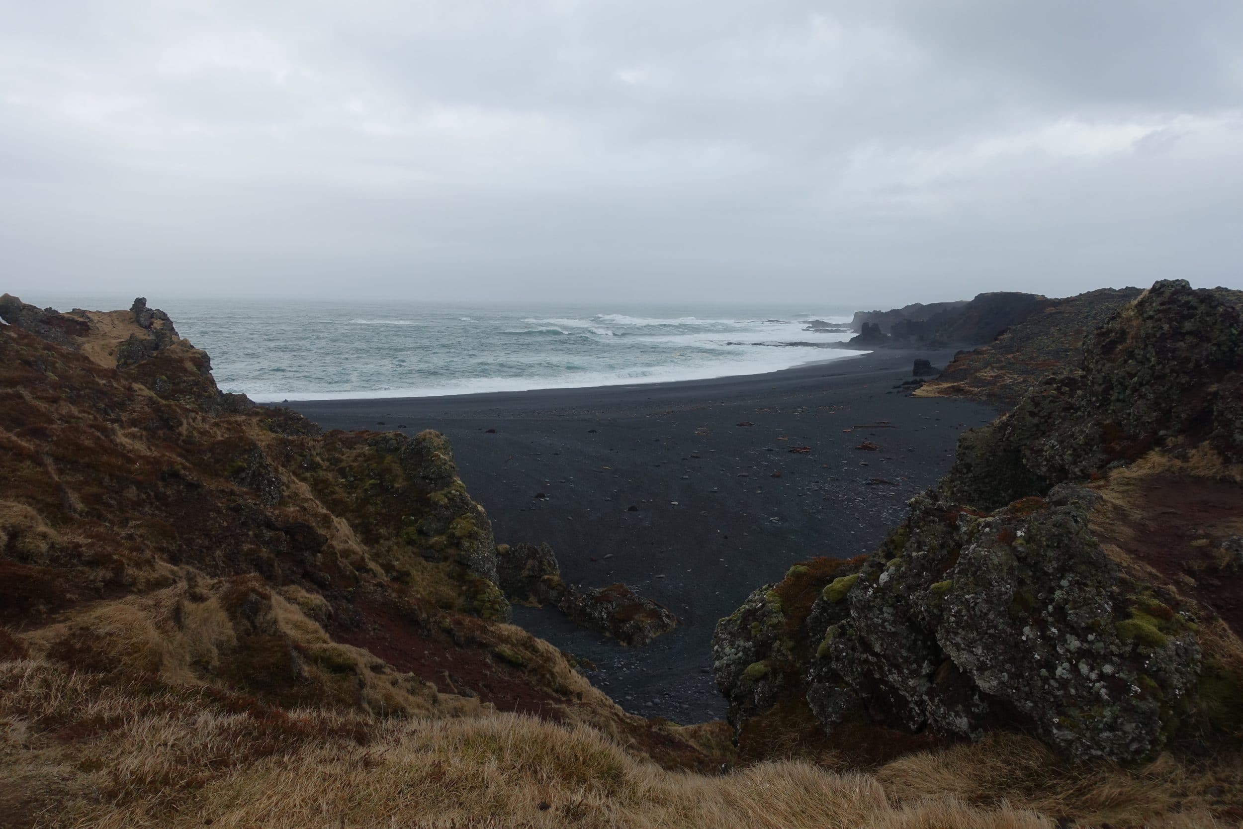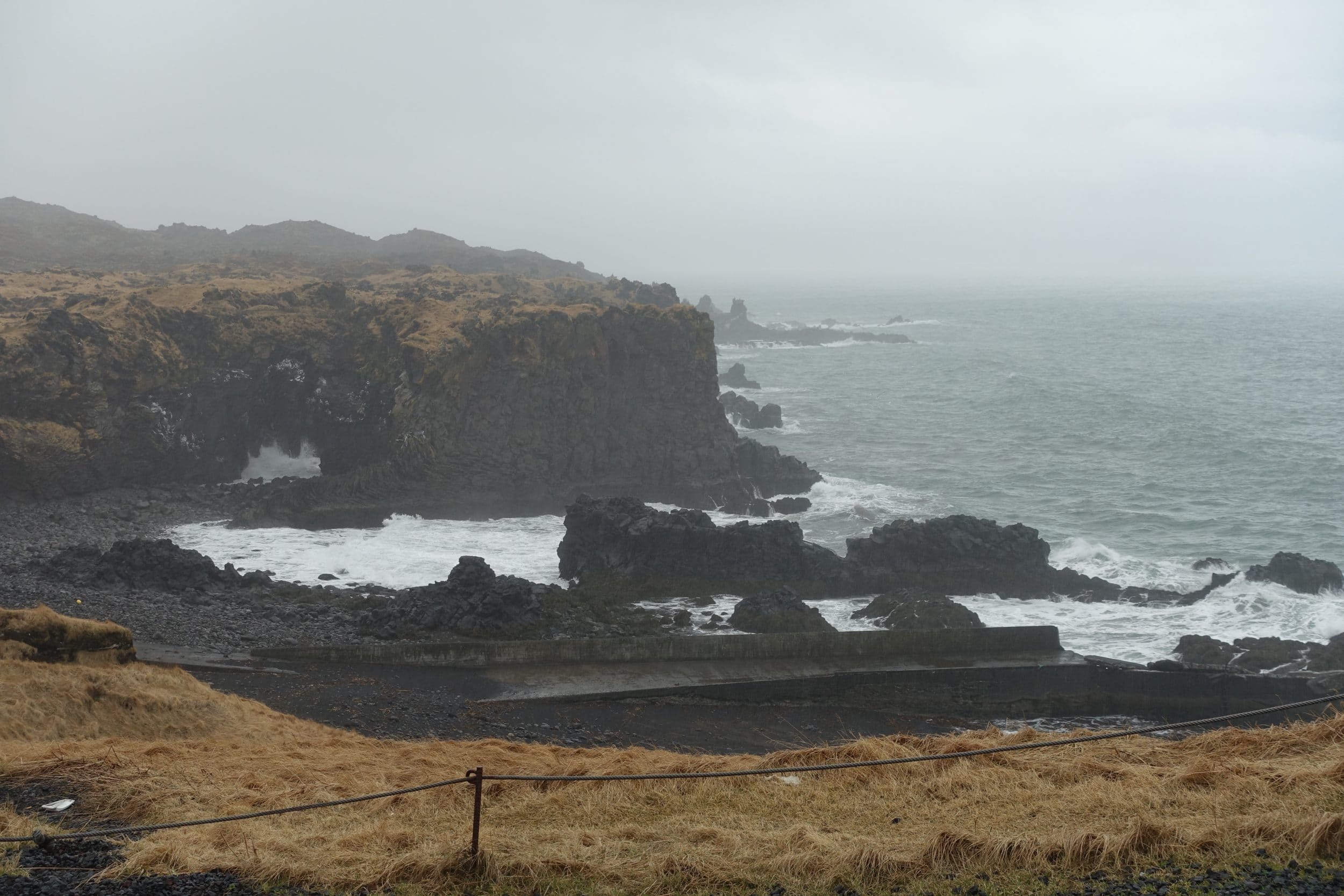 Un piccolo sentiero conduce a questo punto di vista sulla spiaggia di Djúpalónssandur. Ci sono molti altri punti di vista (tra 1 km e 2 km) per esplorare di più e più lontano, ma non ne abbiamo voglia quando piove corde come questa.