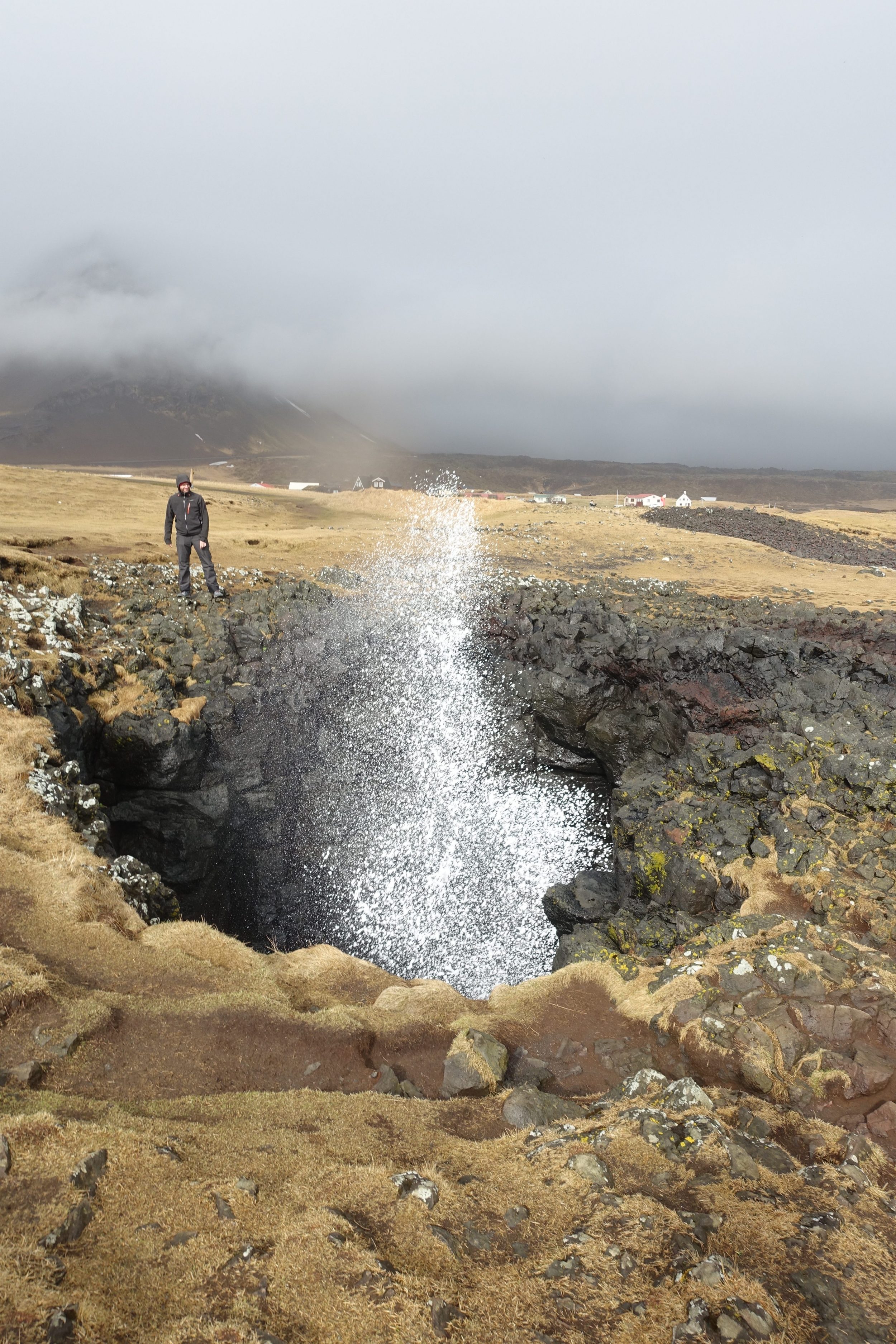 C’è anche uno sfiatatoio. Se ti posizioni bene, puoi vedere fino al fondo del buco, circondato da colonne basaltiche, è molto bello, ma fai attenzione perché le onde sono molto forti.