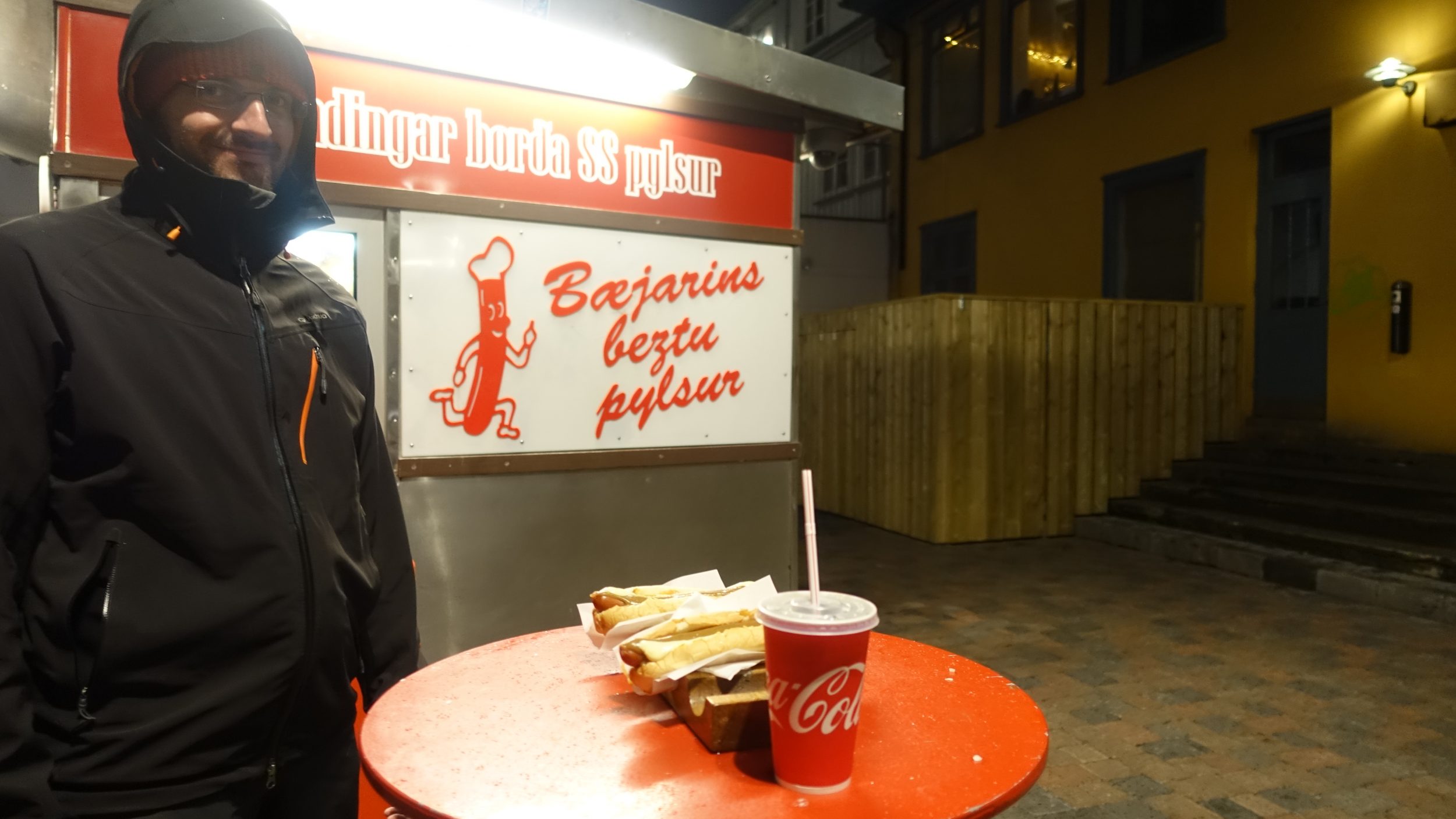 Avendo pranzato tardi, optiamo semplicemente per un hot dog a Baejarins Beztu Pylsur. A quanto pare, è il miglior hot dog della città, e persino Bill Clinton è venuto qui