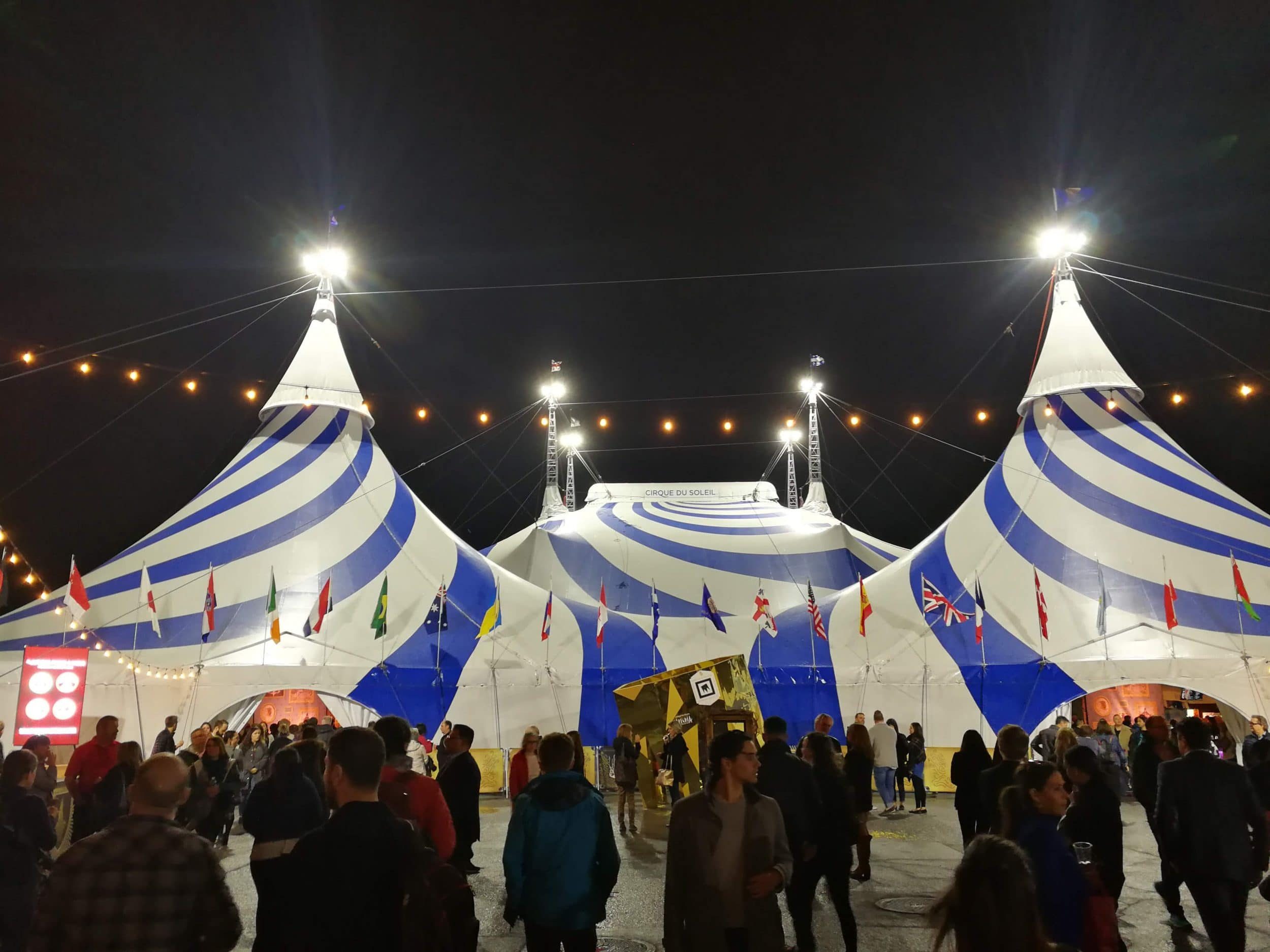 Mentre alcuni spettacoli del Cirque du Soleil si svolgono ora in teatri o sale da concerto, è alla vecchia maniera, sotto un tendone, che ci godremo lo spettacolo. Questo è piantato nel vecchio porto di Montreal.