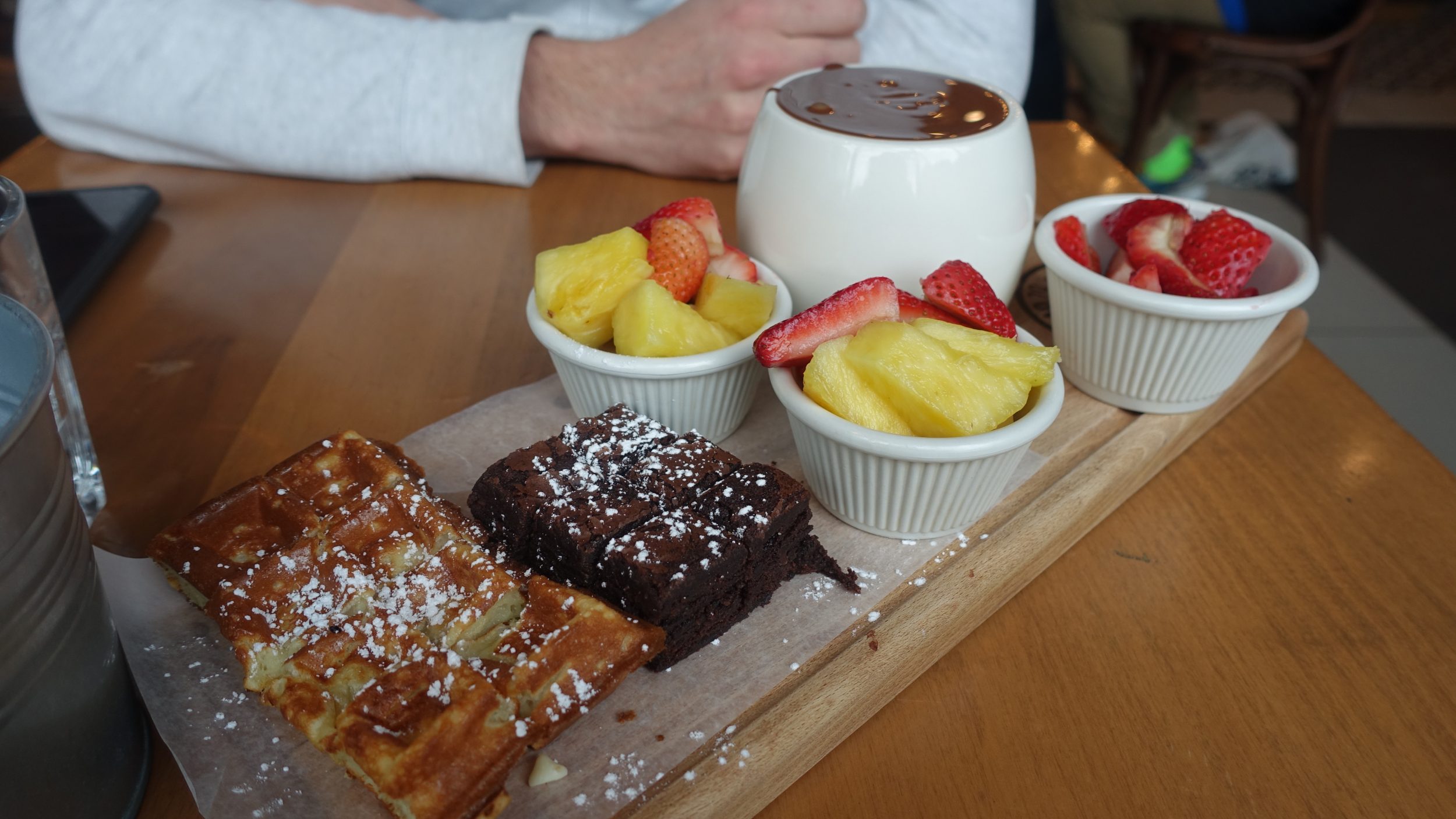 Affoghiamo i nostri dispiaceri (la pioggia è tornata) in un caffè 100% cioccolato. Noi optiamo per una fonduta di cioccolato, deliziosa!!!