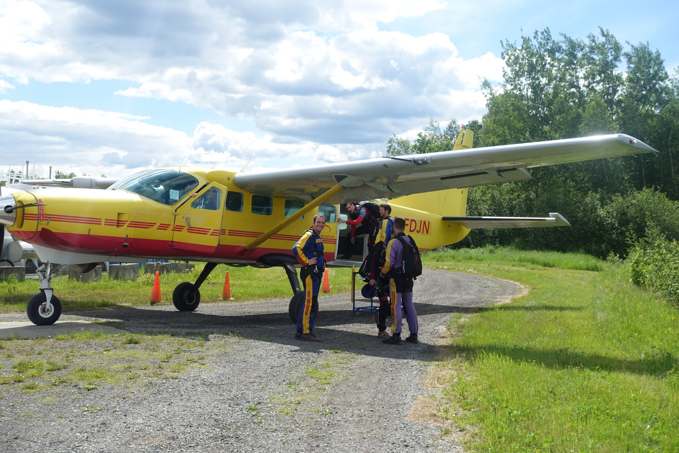 All’arrivo al centro (Parachutisme Adrénaline Saint-Jérôme), apprendiamo purtroppo che il posto di copilota sarà occupato da un pilota in formazione. Il personale è molto gentile e propone ad Anh di… per equipaggiarsi come se dovesse lanciarsi con il paracadute e salire sull’aereo. Una volta in cima, può decidere se saltare o no e pagare dopo se ha deciso