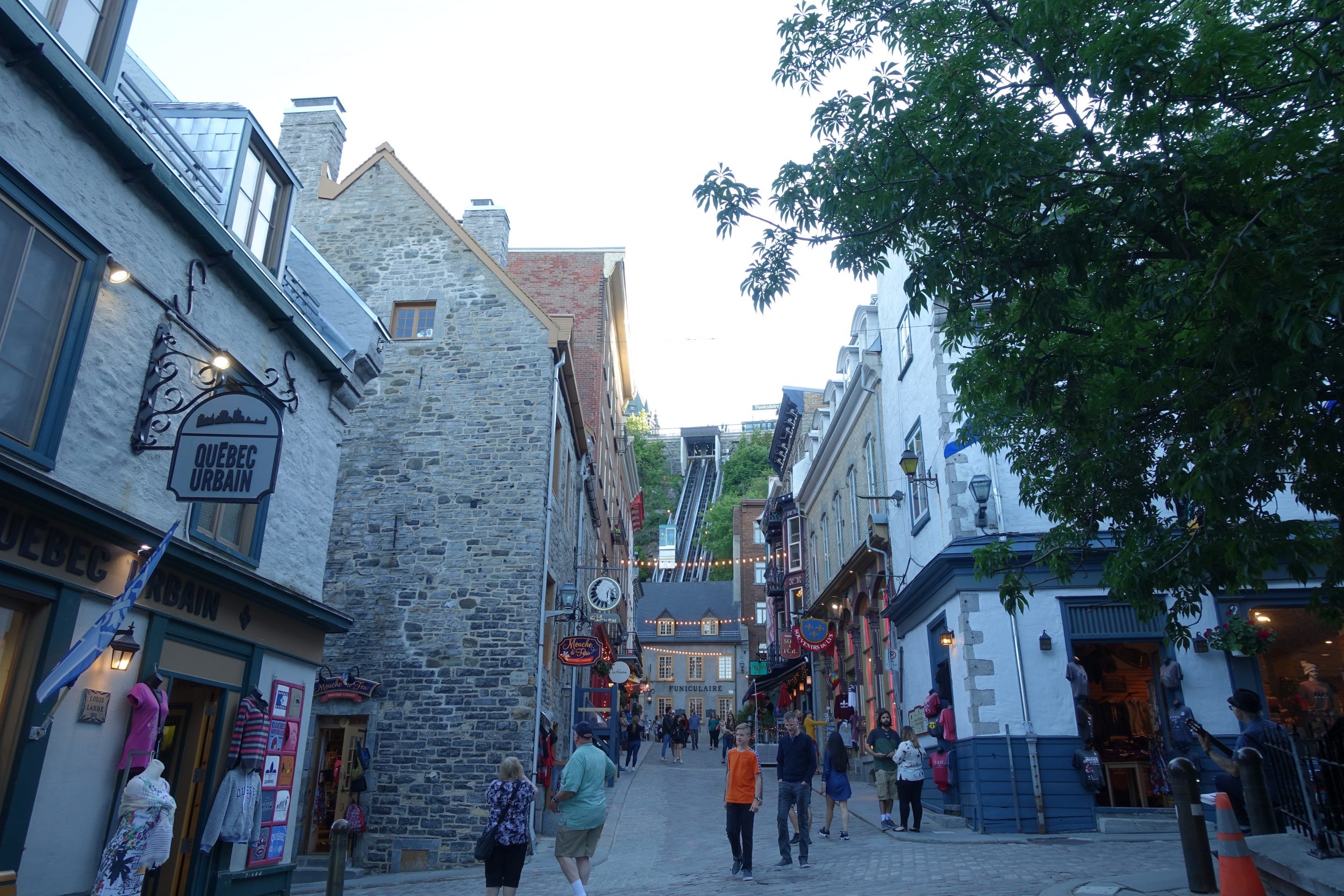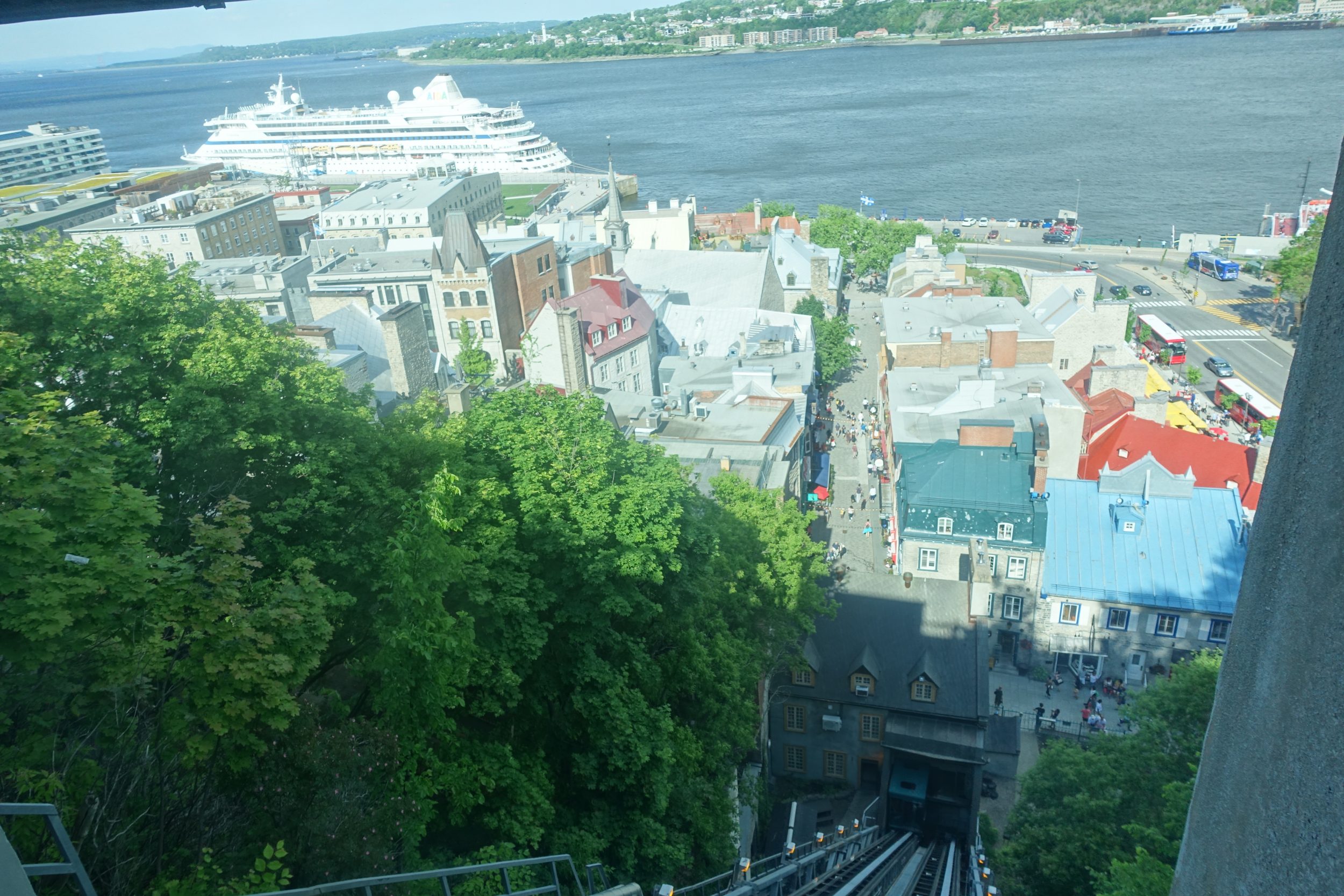 Saliamo fino alla funicolare e risaliamo senza sforzo. Prima si usava solo per andare in cima alla collina, ed era coperto. Poi, la moda delle funicolari panoramiche gli ha fatto perdere il tetto e ora possiamo prenderlo per 3,5 $ CAD/giorno/persona (solo pagamento in contanti).