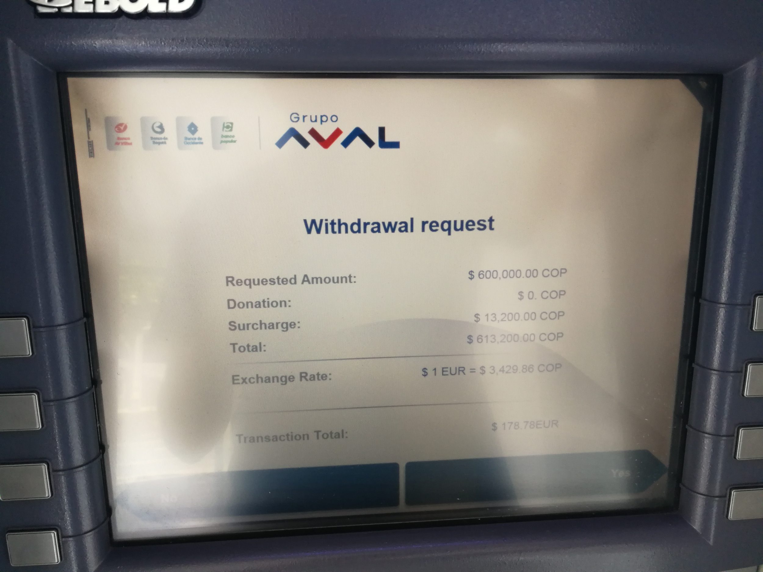 In questo esempio, il bancomat mi informa che il prelievo mi costerà 13.200 cop (3,54 euro). Si tratta di commissioni applicate dalla banca locale e non dalla vostra banca francese. Queste sono commissioni fisse, non c’è modo di evitarle se non confrontando le commissioni con altre banche.
