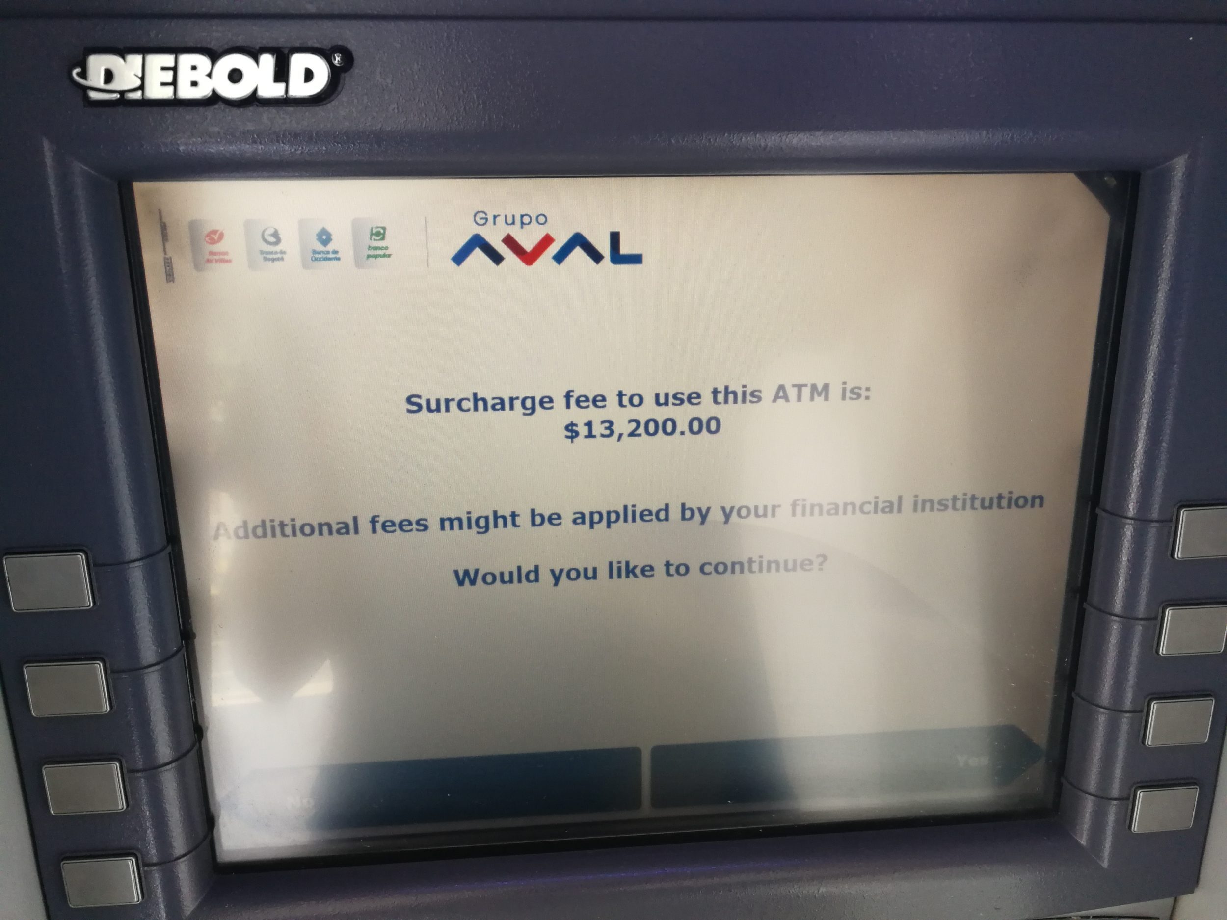 Per esempio, in Colombia, il bancomat dell’aeroporto ci ha fatto pagare 14.520 poliziotti o poco meno di 4 euro. Negli Stati Uniti, i bancomat ci facevano pagare tra i 3 e i 7 dollari a seconda della banca.