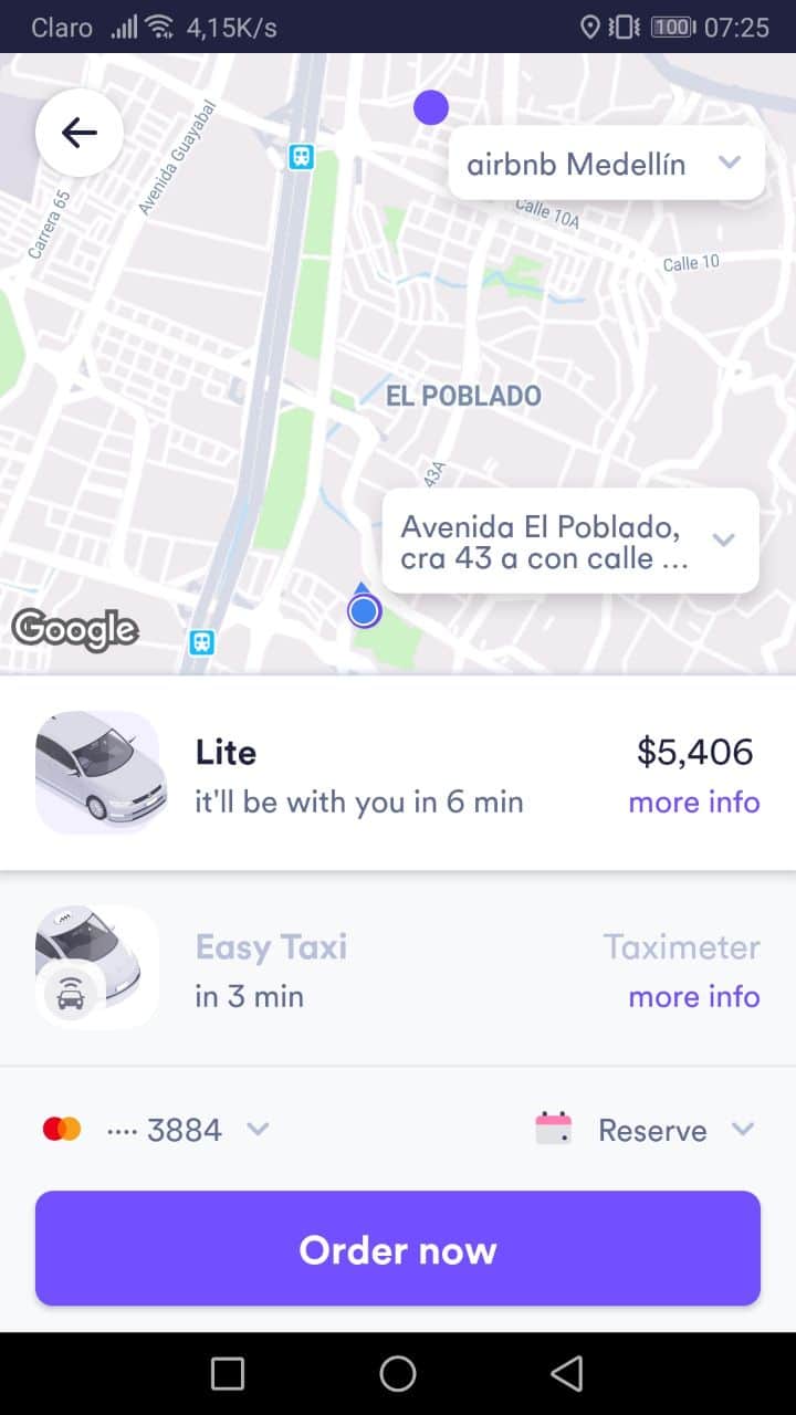 Da un punto di vista tariffario, sono molto simili a quello che offre Uber. In questo esempio, per la stessa corsa, la tariffa di Cabify è di 5.406COPvs