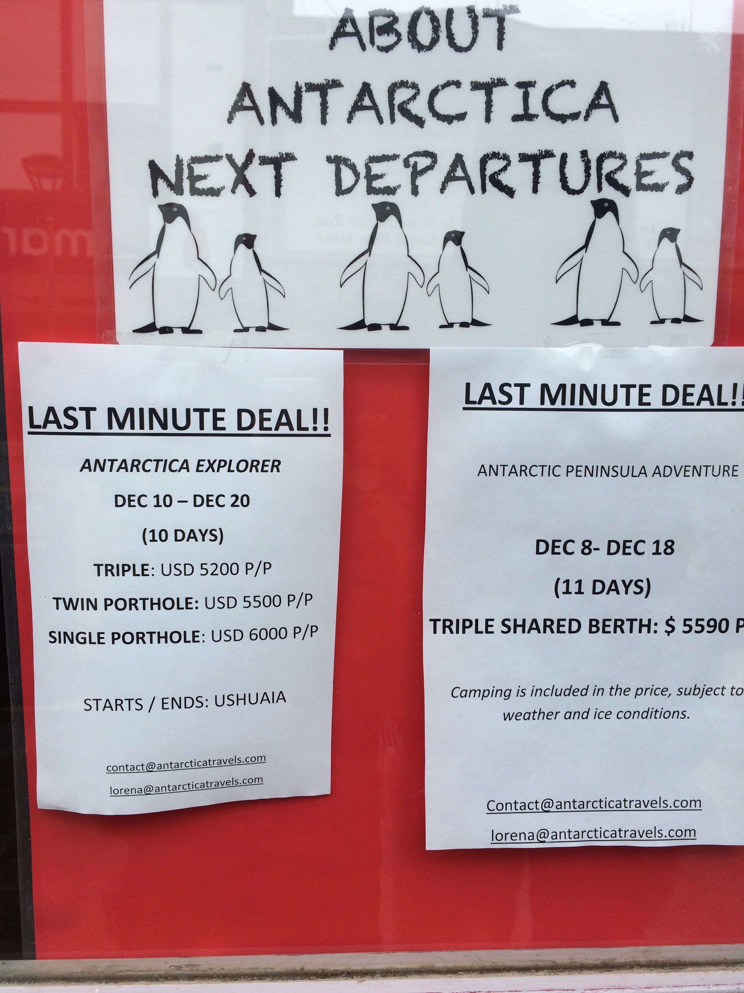 Ushuaia è il punto di partenza della maggior parte delle imbarcazioni per l’Antartide. Le offerte dell’ultimo minuto possono essere trovate molto facilmente. Onestamente, non so se 5000 USD per 10 giorni all’ultimo minuto sia un buon prezzo
