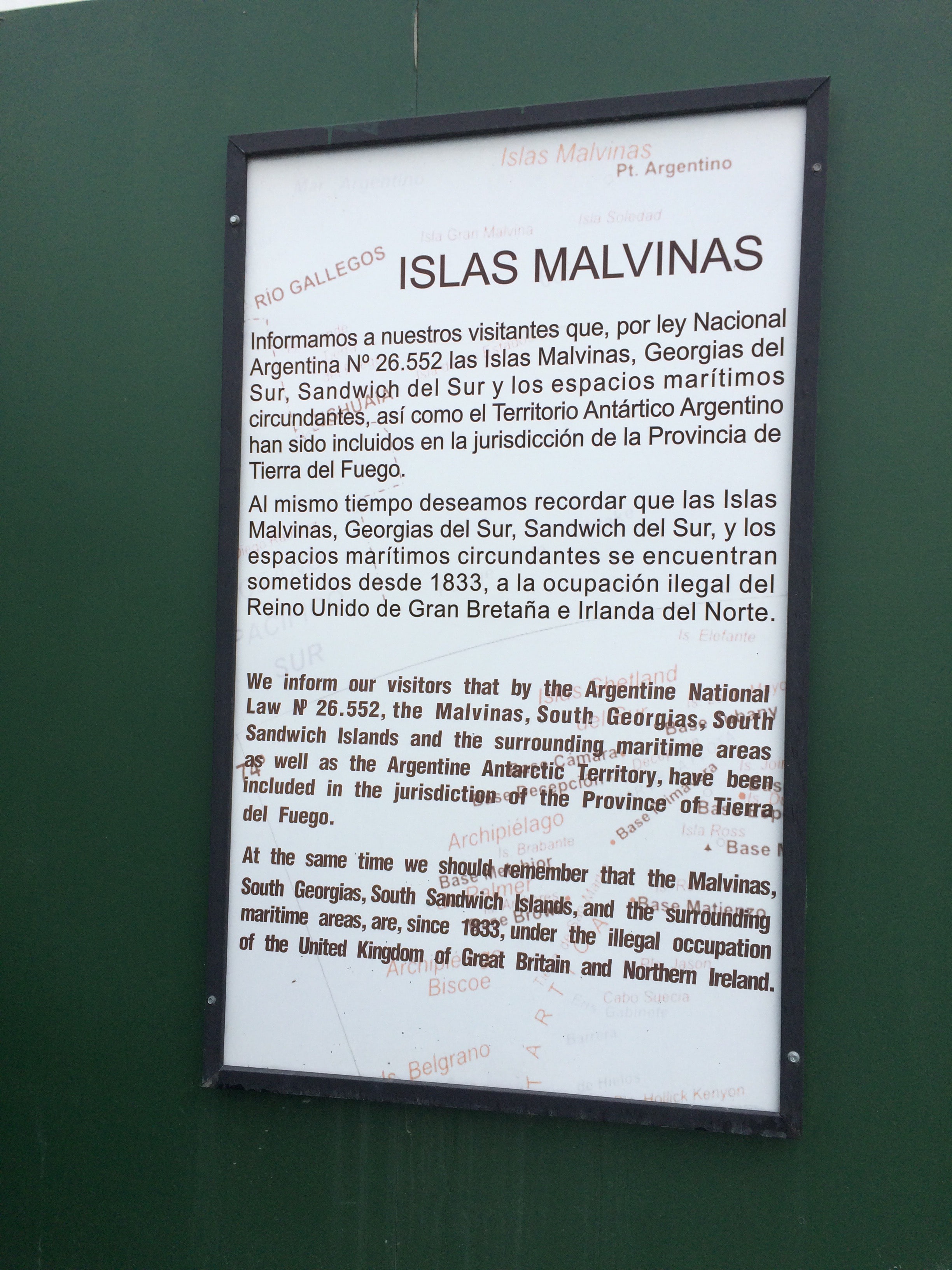 Mentre si passeggia, ci si imbatte in una sorta di memoriale per le Falkland. Questa vecchia disputa territoriale è stata persino oggetto di un conflitto armato nel 1982. Sembra che gli argentini non l’abbiano ancora digerito, come dimostra questo cartello che invoca i “pirati inglesi”