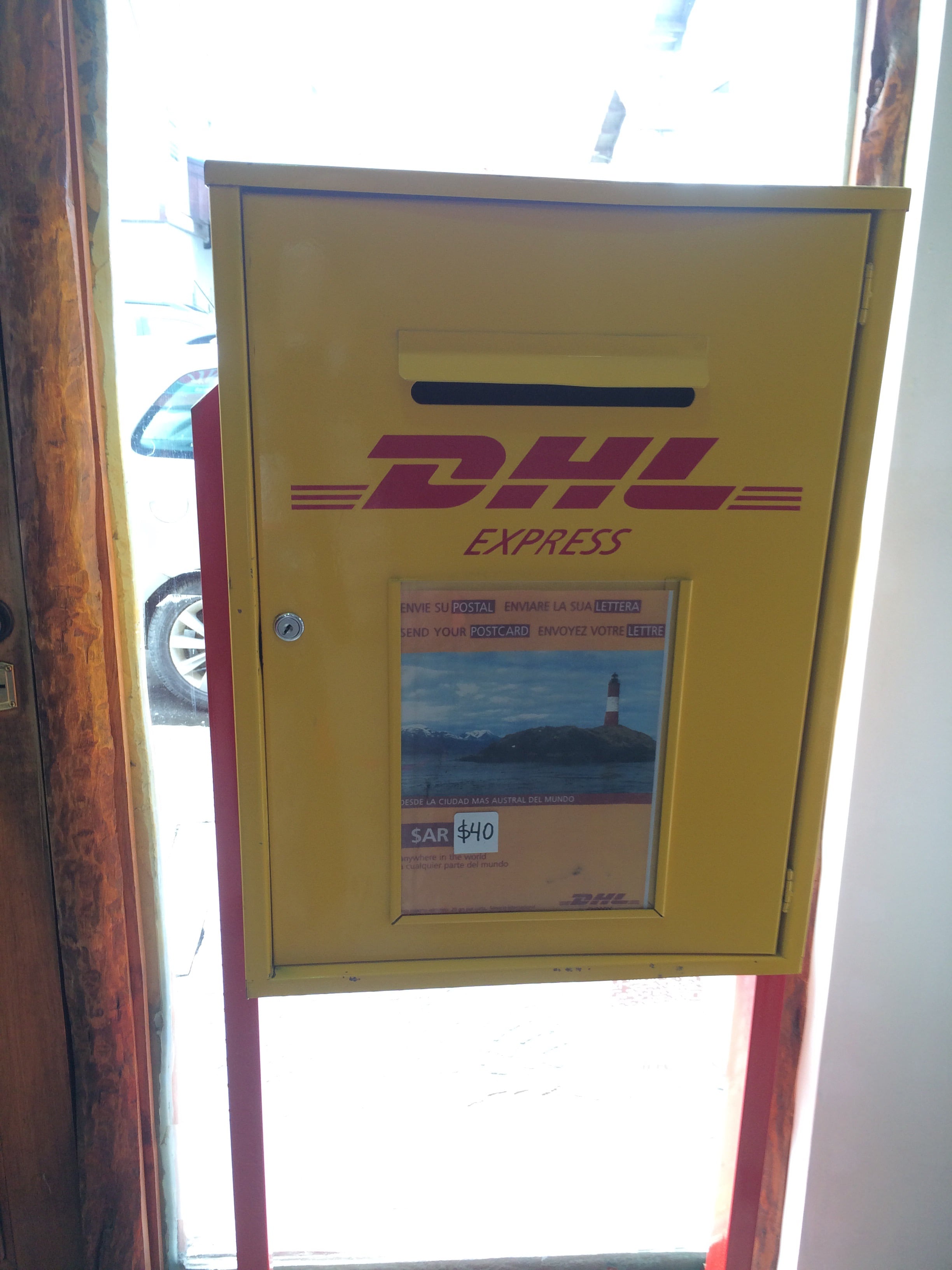 La differenza è dovuta al fatto che abbiamo comprato inconsapevolmente dei francobolli DHL. Così non dobbiamo consegnare le nostre cartoline all’ufficio postale ma proprio davanti al negozio Barraca Patagonia, che ha una casella DHL