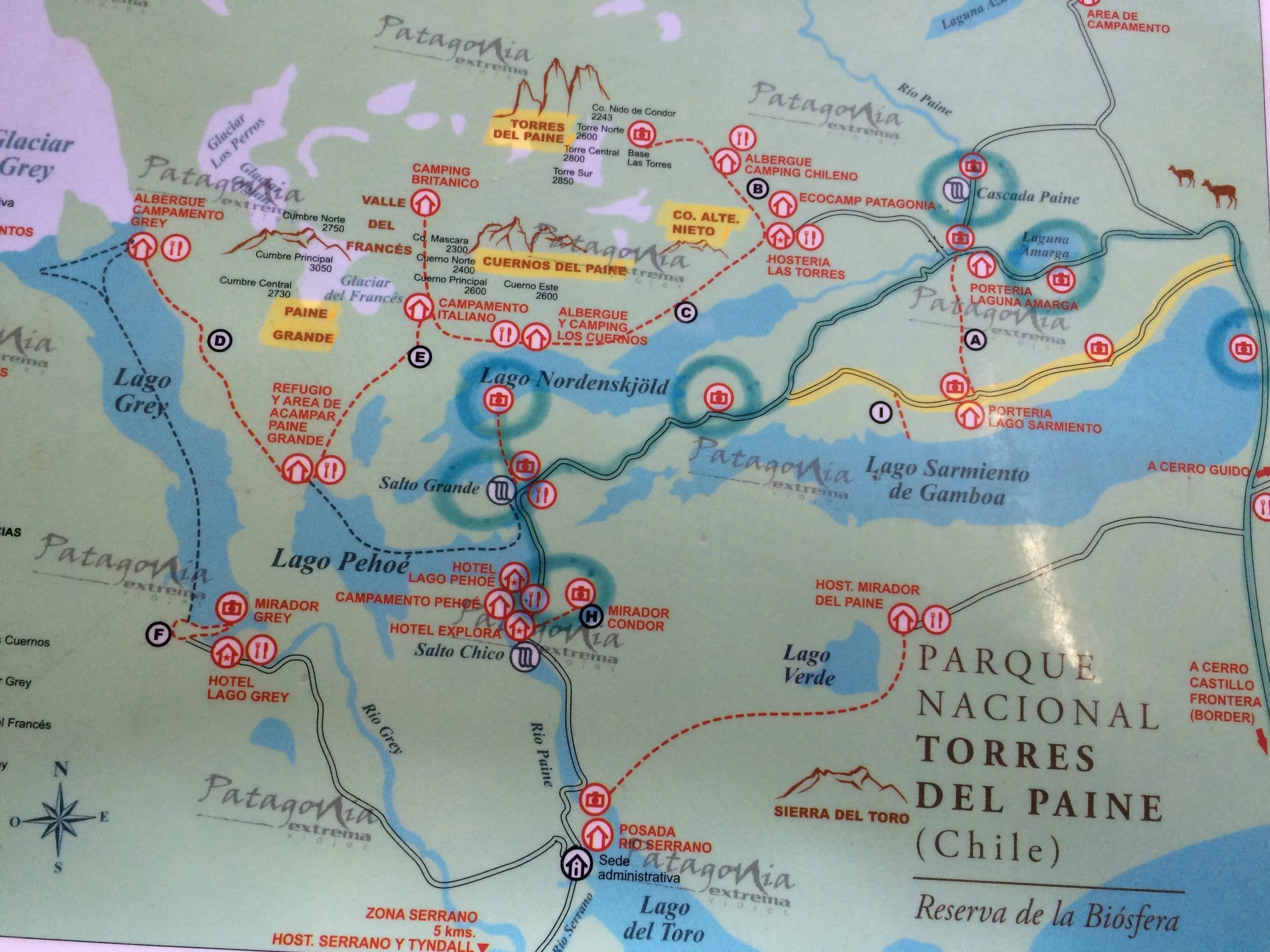 Piccola parentesi riguardo all’escursione al parco Torres del Paine: trovo che ci sono pochissime indicazioni nel parco, la mappa del parco è molto approssimativa, le due cascate che ci sono piaciute molto non sono indicate su di essa per esempio. Bisogna davvero farsi lasciare dove inizia il trekking perché la strada per i trekking non è niente di eccezionale ed è super lunga. Se pensate di passarci qualche giorno, chiedete bene prima e comprate una mappa dettagliata. Ci sono piccoli sentieri che non sono sulla mappa gratuita, che si è tentati di prendere a rischio di perdersi. Tuttavia, il vantaggio del famoso W trek in questo parco è che si può dormire in veri letti e fare docce calde.
