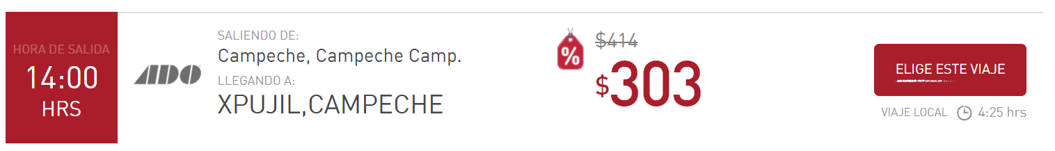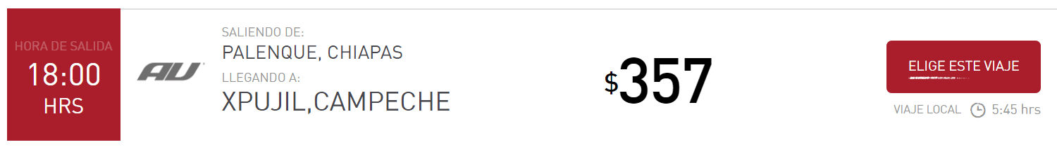 - 1a classe Campeche => Escarcega (partenze alle 02h15, 11h, 14h, 16h45, 23h10) per 227MXN, 2h05