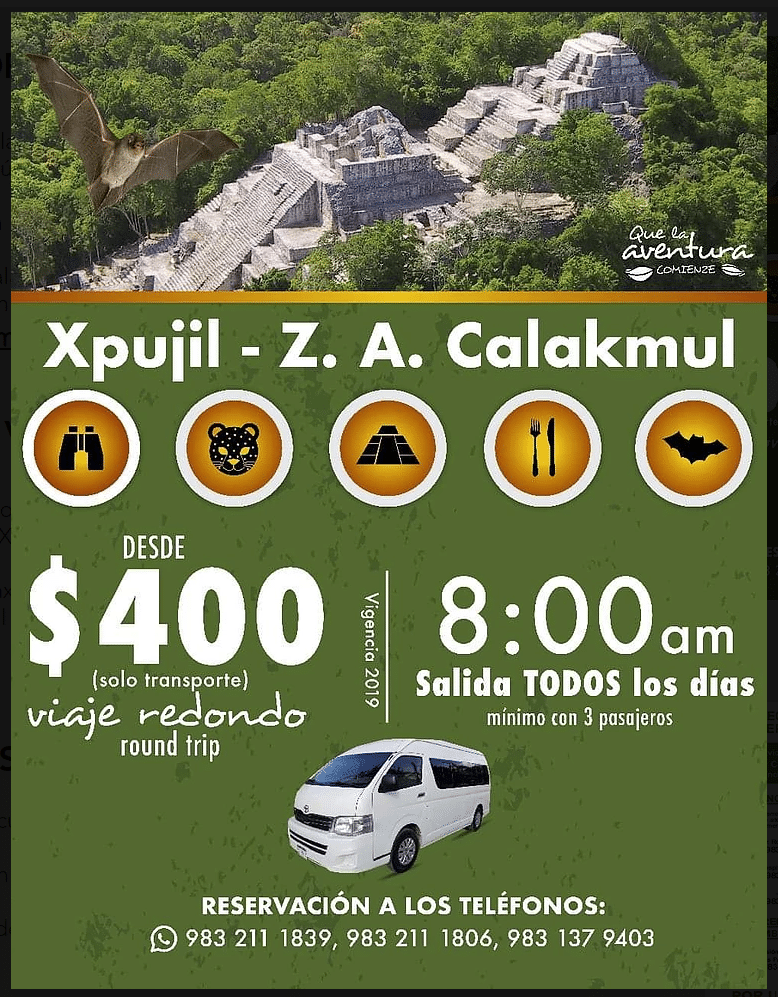 - se siete meno di 3: prendete la navetta alle 8 del mattino, per 400MXN andata e ritorno a persona. Partenza ogni giorno. Si può prenotare per telefono: +521983 211 1839; +521983 211 1806; +521983 137 9403 o tramite la loro pagina Facebook. Mi dicono che potranno fermarsi davanti alla grotta dei pipistrelli se i passeggeri lo richiedono. Fate attenzione, non c’è niente da mangiare sul posto, quindi portate cibo e bevande