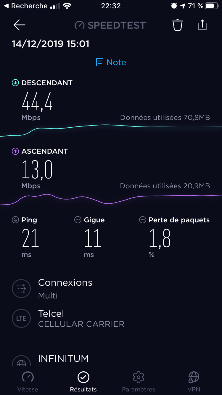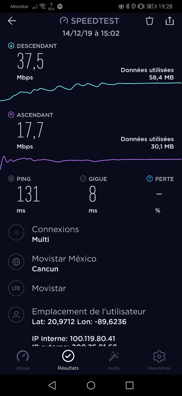Durante questo test effettuato a Mérida il 14 dicembre 2019, Movistar e Telcel avevano portate identiche. Vale a dire 37Mo/s in download e 17Mo/s in upload, che è molto corretto.