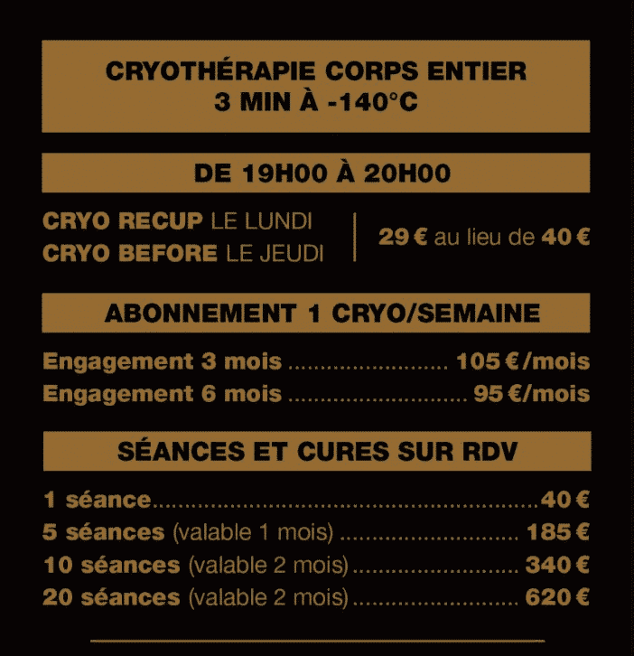 Sono venuto al Centro Uno un lunedì sera per godere del “Cryo recup”, la sessione a 29 € invece di 40 €. Dopo la mia sessione, quando è stato il momento di pagare, la persona incaricata mi ha chiesto 40 €. Quando non ho capito, mi ha spiegato che la prima sessione era di 40 € e le successive di 29 €. Essendo ben consapevole che il prospetto era molto confuso, ha gentilmente accettato di applicare la tariffa di 29 €.