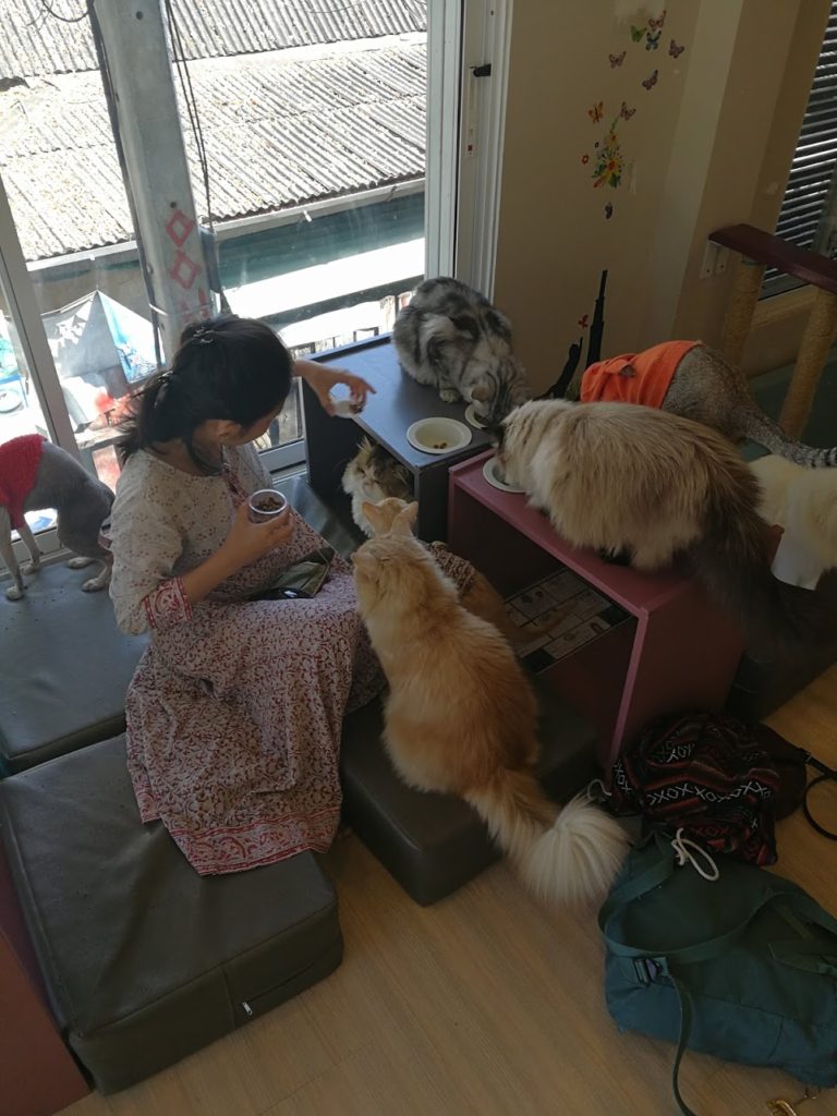 Finiamo in un caffè per gatti. Il concetto è semplice, si paga un drink o 100 baht per andare a vedere una dozzina di gatti al primo piano. Potete anche comprare delle crocchette extra (20 bahts/vasetto) per attirare i gatti verso di voi